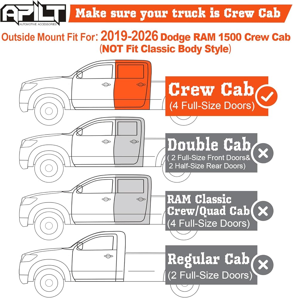 انتباه! تحقق من طراز وسنة سيارتك قبل الشراء. تم تصميم واقيات المطر السميكة من APILT لعام 2019،2020،2021،2022،2023،2024،2025،2026 Dodge RAM 1500 Crew Cab (لا تناسب Dodge Ram 1500 Classic 2019-2026).