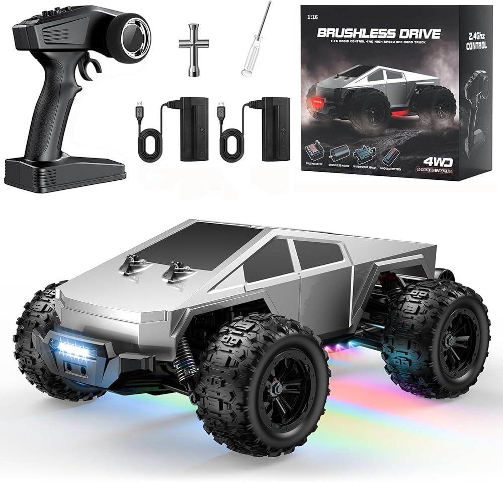 سيارات RC سريعة بدون فرشاة 1/16 للبالغين، سيارة تحكم عن بعد عالية السرعة بسرعة 35 ميل في الساعة، شاحنة سايبر RC، لعبة شاحنة مونستر 4x4، جهاز تحكم عن بعد 2.4 جيجا هرتز، مركبة للطرق الوعرة لجميع التضاريس، إضاءة LED ملونة، هدية للأطفال