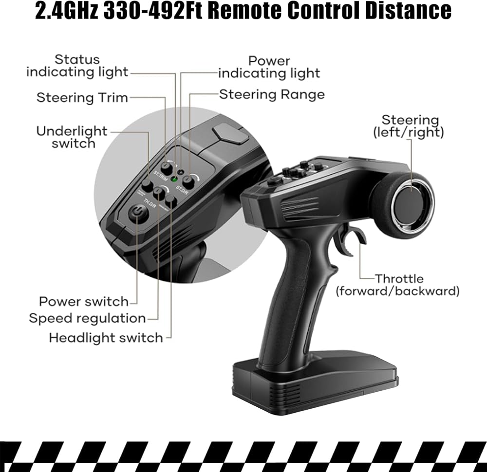 【نظام تحكم عن بعد عالي الأداء】استمتع بنظام تحكم لاسلكي متناسب كامل الوظائف مع نطاق 100-150 متر. يدعم التحكم في مستوى السرعة، والدقة للأمام، والخلف، والدوران، والانجراف، والحركات المثيرة بالدراجة، ومناورات عبور العوائق. استمتع بتحكم لا مثيل له وتعدد الاستخدامات مع شاحنة الوحش RC المتقدمة هذه.