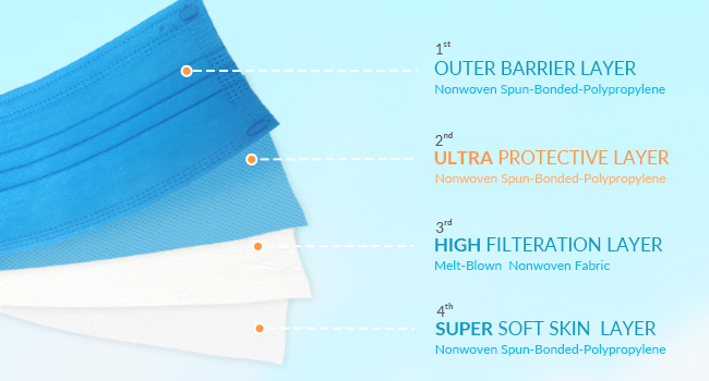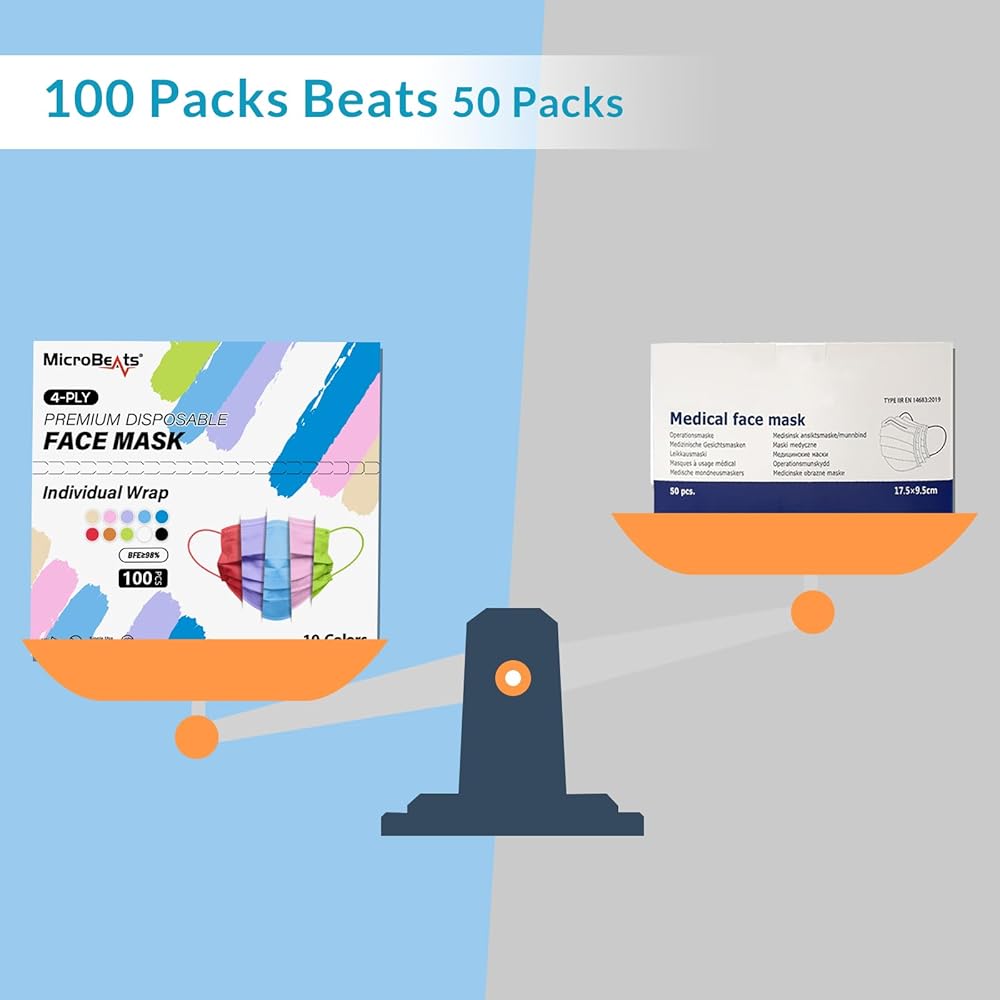 4 طبقات: يتميز كل قناع طبي ببنية قوية ولطيفة مكونة من 4 طبقات، مما يوفر ترشيحًا محسنًا لطيفًا على بشرتك. توفر أقنعتنا الملونة، المغلفة بشكل فردي من أجل نظافتك، أكثر من مجرد حماية فائقة، ولكنها توفر أيضًا راحة الاستخدام الفردي. وهذا يضمن الحفاظ على سلامتك بطريقة مريحة وجديدة قدر الإمكان.