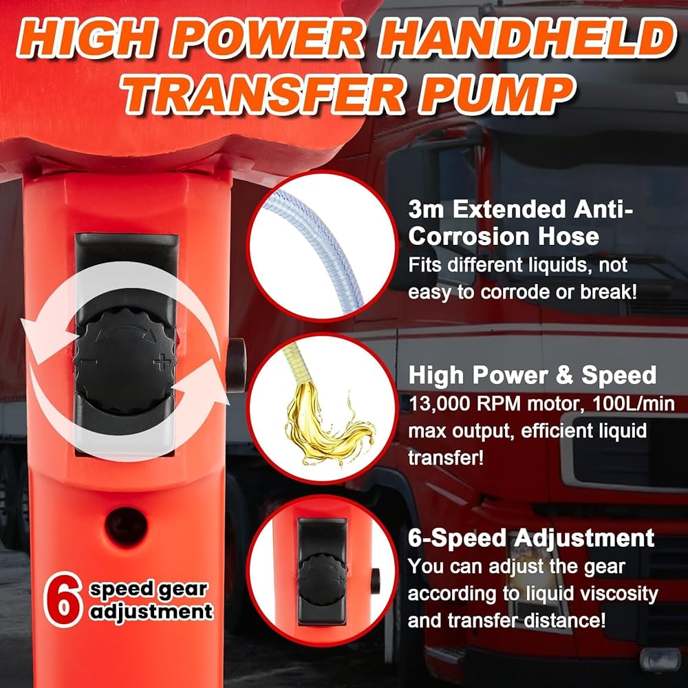 مضخة نقل كهربائية 2480 واط: تعمل مضخة نقل السوائل الكهربائية عالية الطاقة 110 فولت 2480 واط بسرعة تصل إلى 13,000 دورة في الدقيقة، مما يوفر طاقة قوية لنقل السائل. مع معدل تدفق يتراوح بين 80-100 لتر/دقيقة، يمكنه التعامل بسرعة مع العديد من السوائل منخفضة اللزوجة مثل الديزل وزيت المحرك والماء والكيروسين - مما يساعدك على توديع النقل البطيء وتعزيز كفاءة العمل.