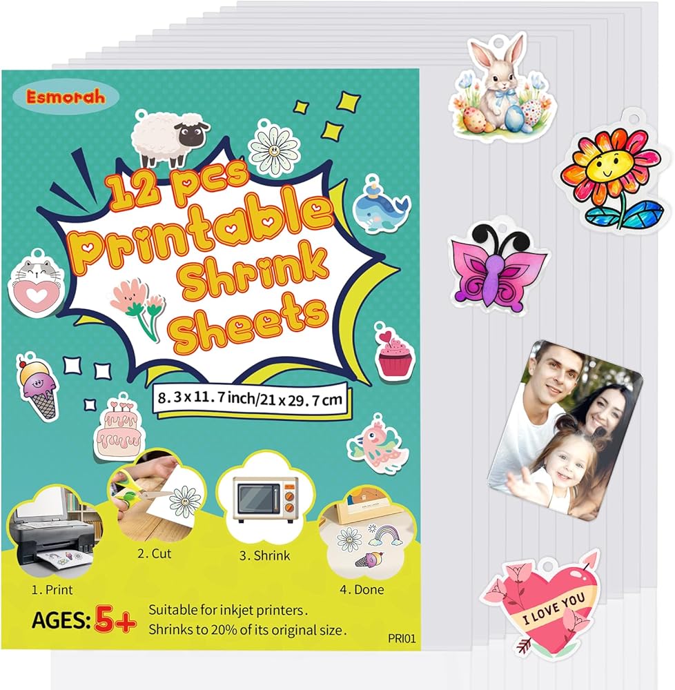 【ورق قابل للطباعة】6 قطع من ورق الانكماش شبه الشفاف مقاس A4 مع دليل التعليمات. يبلغ مقاس ورق الطابعة شرينك دينك 8.3 بوصة × 11.7 بوصة (21 × 29.7 سم) وسمك 0.01 بوصة (0.3 مم). تنكمش إلى 20% من حجمها الأصلي وتزداد سماكة إلى بلاستيك متين بعد التسخين. الجانب متجمد لسهولة الطباعة، والآخر لامع للحصول على تشطيبات نابضة بالحياة. يرجى ملاحظة استخدام الجانب المتجمد للطباعة