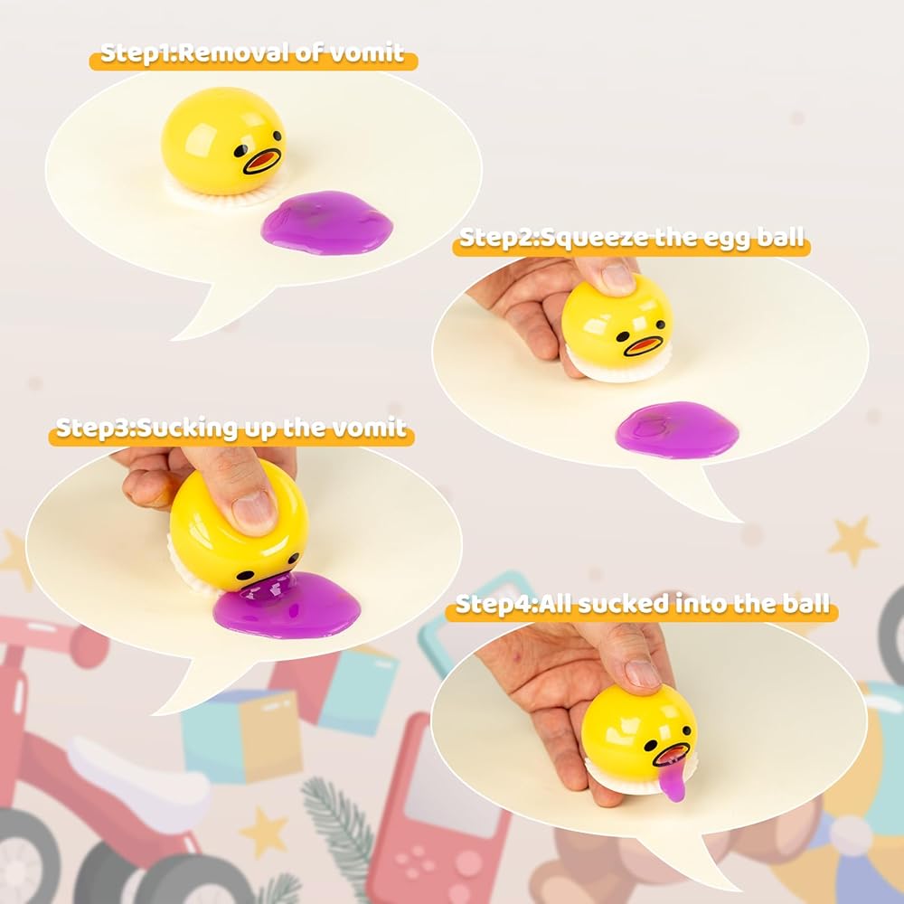 الخطوات: افتح كيس التغليف، وضعه على الطاولة، واضغط على كرة صفار البيض، واترك الفم لسائل البيض واتركه، وسوف تستنشق بيضة القيء سائل البيض بسهولة، ثم اضغط عليها وتقيأها بشكل متكرر لبدء ألعاب جديدة.