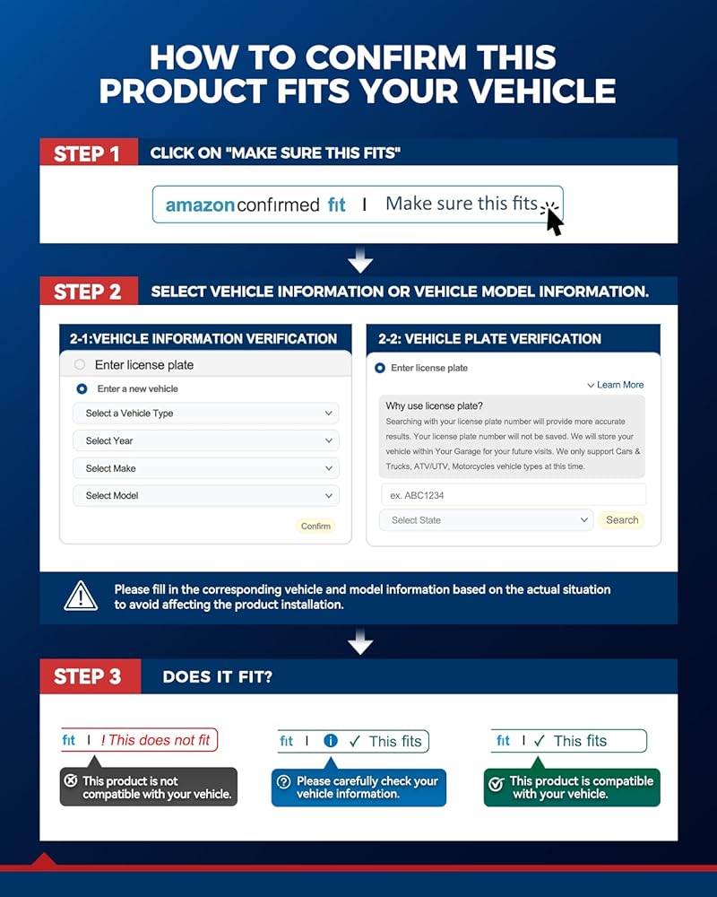 [ملاحظة]: يرجى التحقق من شريط "Amazon Confirmed Fit" الموجود أعلى هذه الصفحة قبل شراء المنتج للتأكد من أن هذا المنتج يناسب سيارتك. إذا كان شريط "Amazon Confirmed Fit" يحتوي على حرف "i" في دائرة زرقاء، فهذا المنتج يحتوي على ملاحظات إضافية. يرجى تمرير مؤشر الماوس فوق "i" على الشريط لرؤية الملاحظات قبل إجراء عملية الشراء.