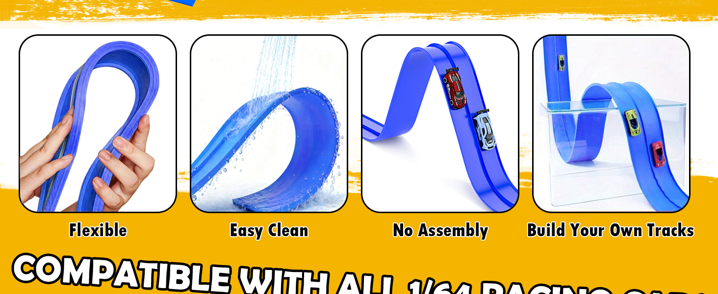【مرن ومحمول - قم باللف والانحناء واللف والانطلاق】مصنوع من مادة TPE عالية الجودة، هذا المسار ناعم لكنه متين، وغير سام تمامًا، وعديم الرائحة، ومقاوم للماء. يمكن لفها بسهولة إلى حلقات ومنحنيات ومنحدرات، ويمكن طيها بشكل صغير لتخزين خالٍ من الفوضى. متوافقة تمامًا مع السيارات المصبوبة بمقياس 1:64 وحتى الرخام، وهي جاهزة للعب الإبداعي في ثوانٍ - لا حاجة للتجميع.