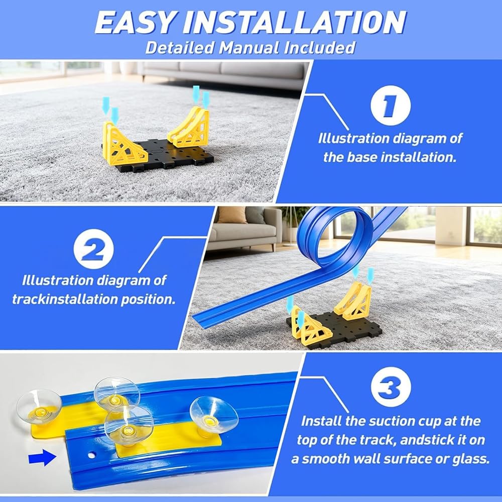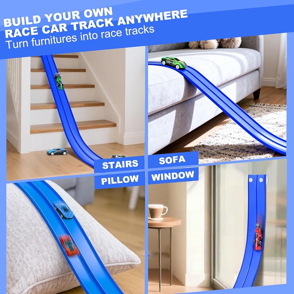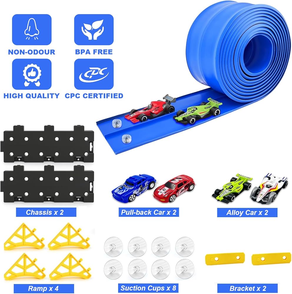 【قم بالبناء في أي مكان، واستمتع بمتعة السباق التي لا نهاية لها】دع السائقين الصغار بعمر 3 سنوات فما فوق ينشئون مضمار السباق الخاص بهم في أي وقت وفي أي مكان! يتميز هذا المسار المرن الذي يبلغ طوله 15 قدمًا بأكواب شفط قوية تلتصق بشكل آمن بأحواض الاستحمام والنوافذ والبلاط والثلاجات. تخلص من التصميمات المسطحة المحدودة، حيث يمكن للأطفال الآن السباق على الجدران أو السلالم أو المقاعد الخارجية الناعمة للحصول على تجربة لعب غامرة ومثيرة حقًا.