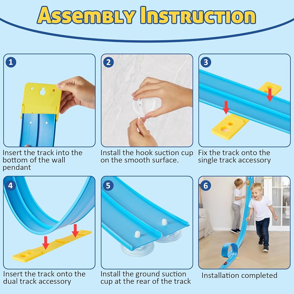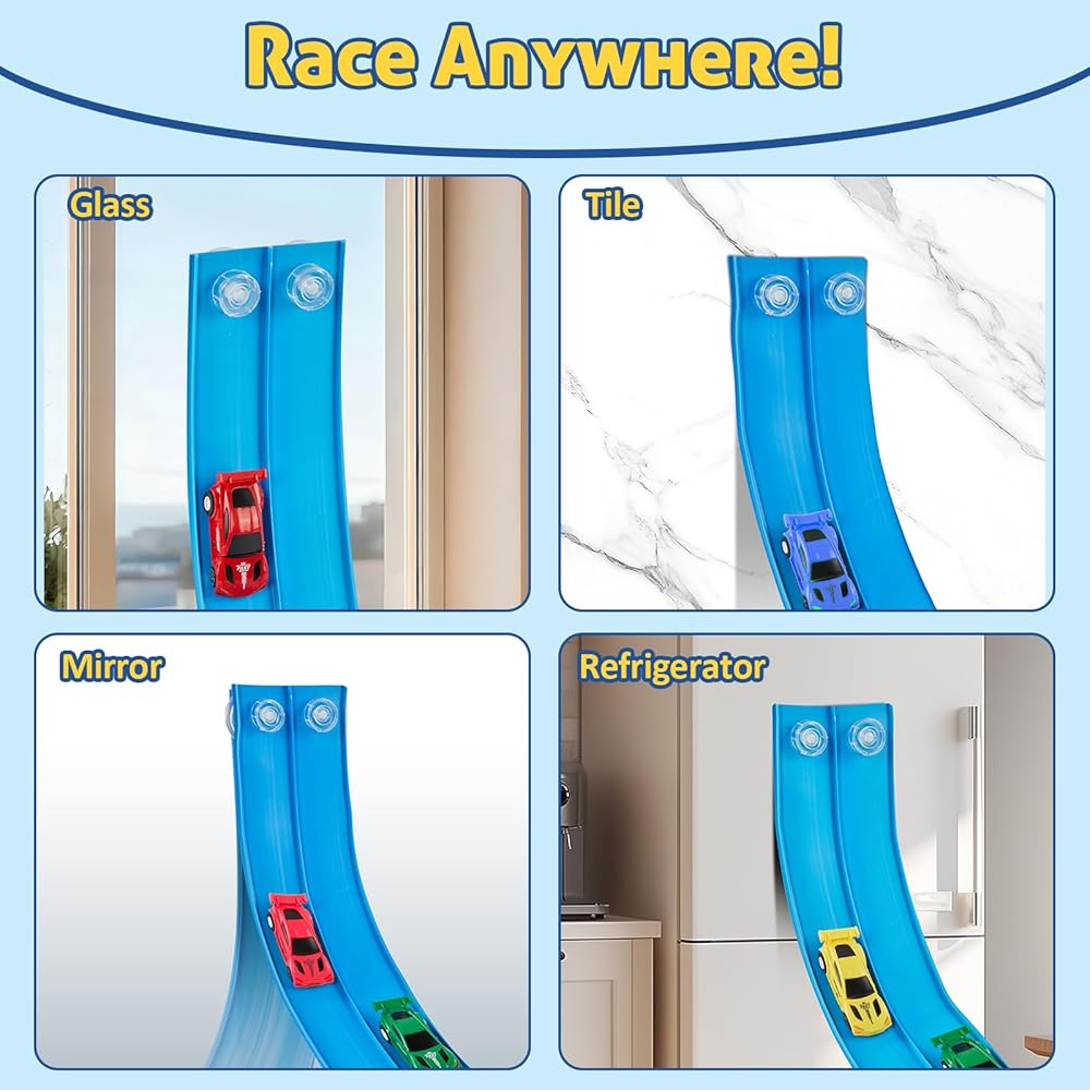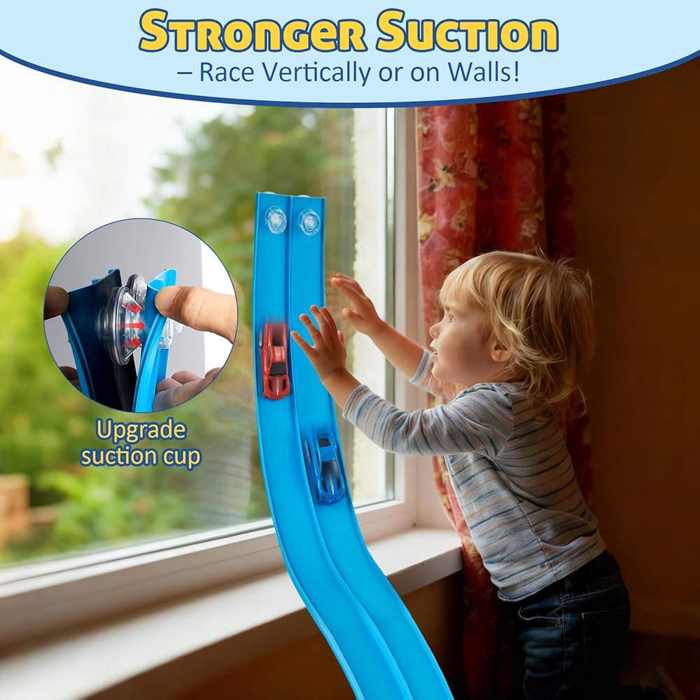 【أكواب شفط قوية】تتميز بأكواب شفط مطورة عالية الإمساك، ويتم ربط المسار بشكل آمن ببلاط الحمام والنوافذ والأبواب الزجاجية والمرايا ودرابزين السلالم والثلاجات والأسطح الملساء الأخرى. يمكن للأطفال التسابق بالسيارات أسفل جدار الدش، أو إنشاء مسارات حائط متعرجة، أو اختبار الزوايا التي تتحدى الجاذبية. يضيف هذا بعدًا جديدًا تمامًا للعب العمودي الذي يبقي الأطفال منخرطين لفترة أطول ويشجع على تجربة أسلوب العلوم والتكنولوجيا والهندسة والرياضيات من خلال التجربة والخطأ.