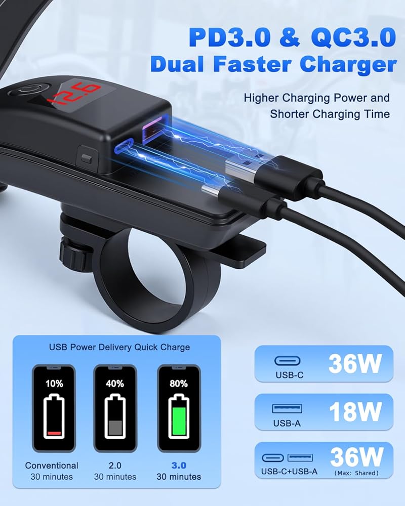 شحن سريع مزدوج USB-A&C: منفذ USB EXTRACTME للدراجات النارية مجهز بمنفذ USB-C بقدرة 36 وات (PD3.0) ومنفذ USB-A بقدرة 18 وات (QC3.0). فهو يجمع بين أقصى خرج إجمالي يبلغ 36 وات، ويوفر شحنًا عالي السرعة للحفاظ على تشغيل أجهزتك طوال رحلتك