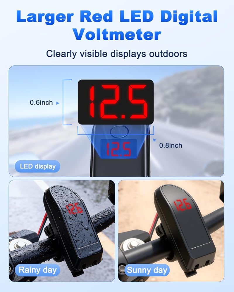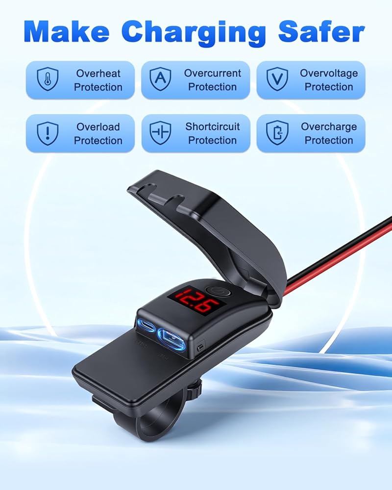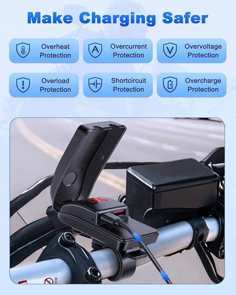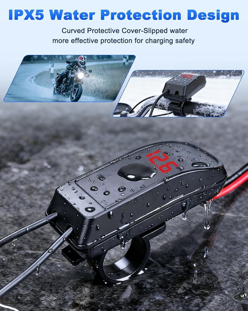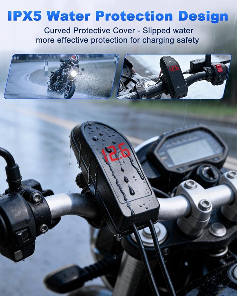 حماية ضد الماء IPX5: يتميز شاحن USB المزدوج للدراجات النارية بتصنيف IPX5 للحماية من المطر أثناء الشحن. يقوم الغطاء الأكريليكي الواقي لمنفذ الشحن بإغلاق المنفذ ويحافظ على ختمه الواقي، مما يضمن السلامة وراحة البال طوال العملية بأكملها، بغض النظر عن التوقعات