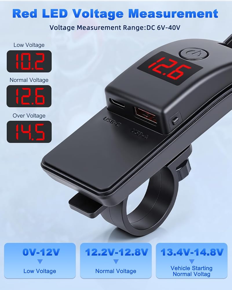 توافق واسع: شاحن الدراجة النارية لجهد إدخال الهاتف هو 6 فولت-40 فولت. يمكنه ضبط خرج الجهد تلقائيًا وفقًا لجهازك (النوع C: 5V/3A 9V/3A 12V/3A 3.3V-11V/3A؛ USB-A: 5V/3A 9V/2A 12V/1.5A؛ Type-C وUSB-A: 5V/3.6A)، وهو متوافق تمامًا مع iPad وiPhone وiPod وGalaxy والكاميرات الرقمية وMP3/MP4 اللاعبين والهواتف المحمولة ونظام تحديد المواقع