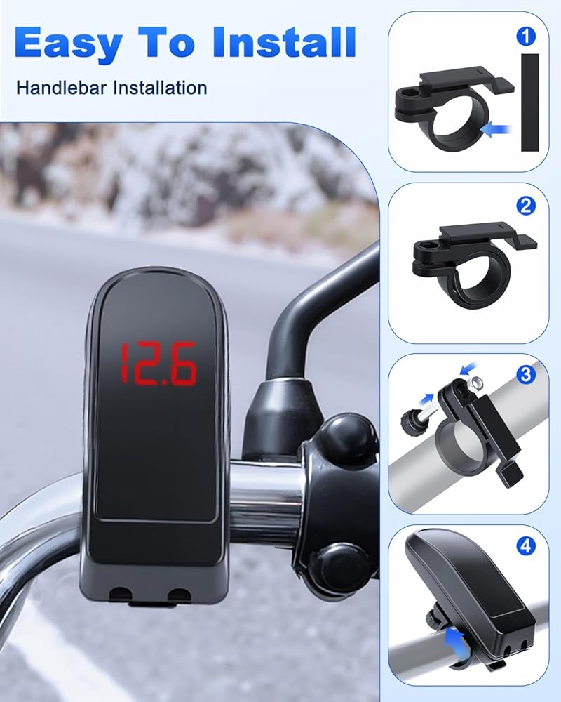 تركيب سريع وعالمي: تم تصميم شاحن الهاتف للدراجات النارية للإعداد بدون أدوات في معظم الطرز المتاحة. ببساطة قم بفك التركيب، ثم ضع حلقة السيليكون، ثم قم بتمريرها على المقود الخاص بك (يناسب الأقطار 1.9-2.2 سم / 0.75-0.87 بوصة)، ثم أعد شدها.
