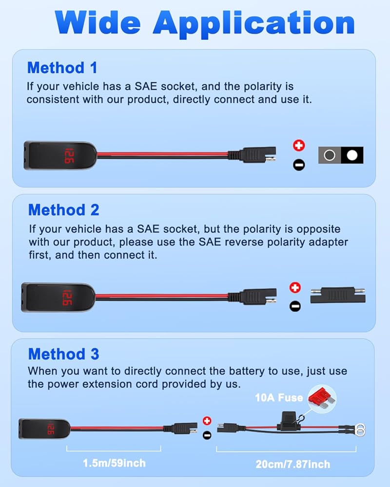 شاحن دراجة نارية SAE إلى USB: يتميز شاحن USB للدراجات النارية بموصل SAE مناسب بشكل مباشر ويشتمل على مصهر 10 أمبير لسهولة التركيب على مركبات DC 12-24V، بما في ذلك الدراجات النارية وطرادات الشاطئ والسيارات وسيارات الدفع الرباعي والقوارب وأجهزة التنقل الأخرى