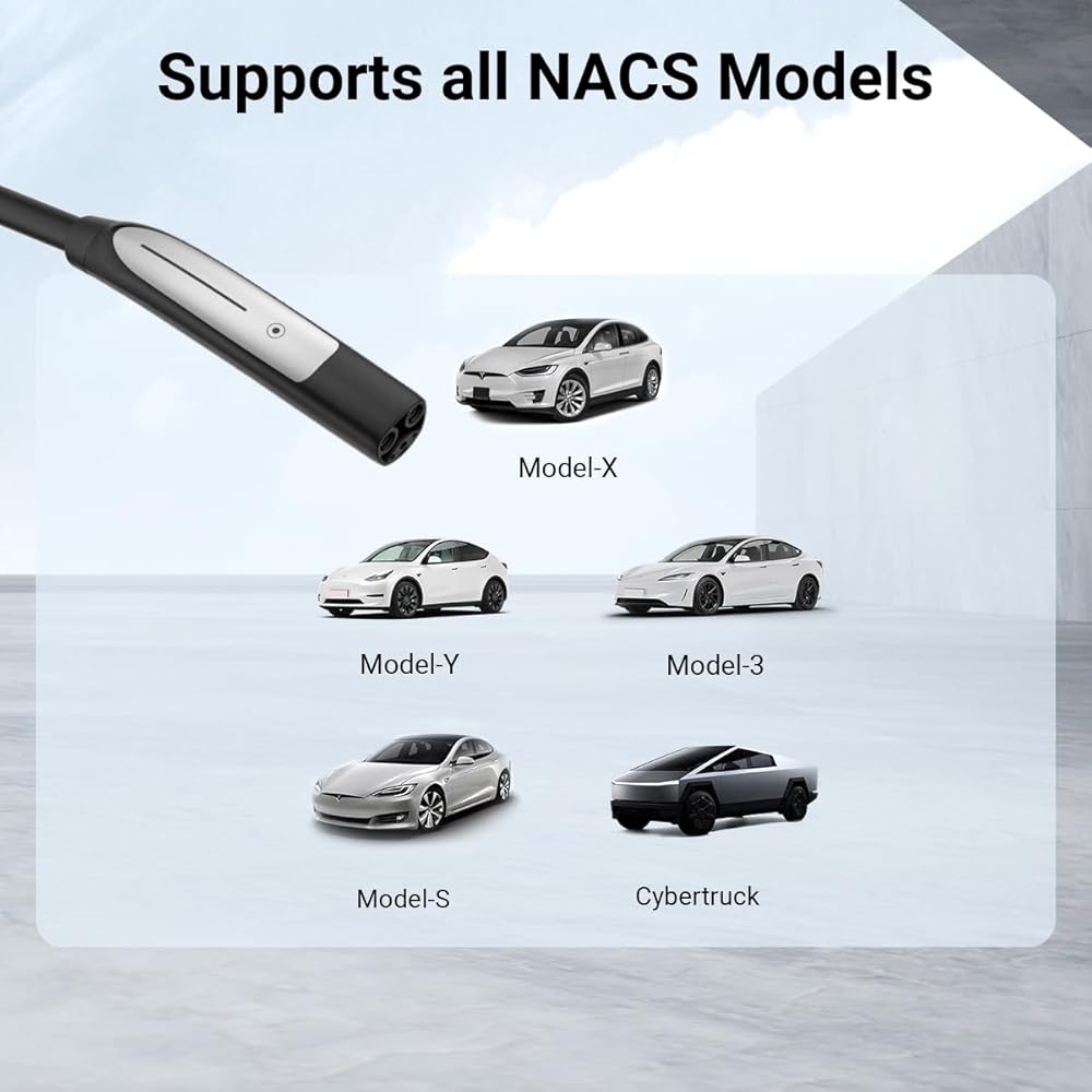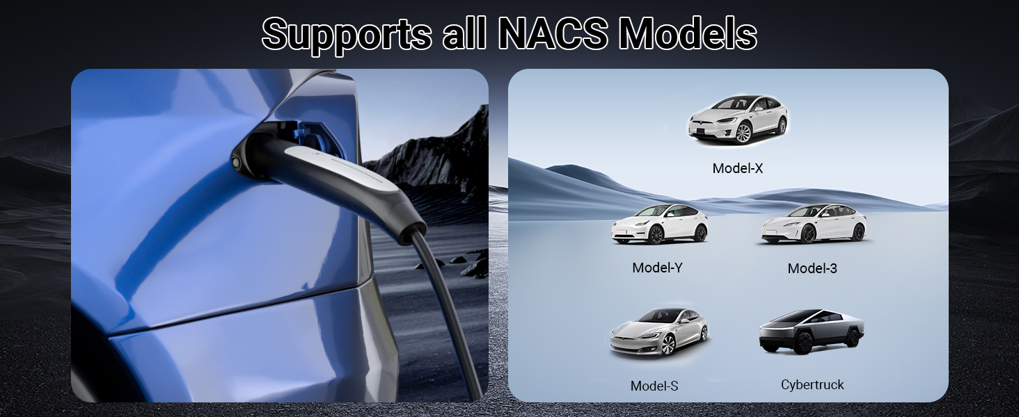🚗【متوافق مع موديلات تيسلا】تم تصميم شاحن EV المحمول هذا بقدرة 16 أمبير خصيصًا لموديلات تيسلا، ويتميز بموصل قياسي للشحن في أمريكا الشمالية (NACS). إنه متوافق تمامًا مع Tesla Model Y وX و3 وS وCybertruck، مما يضمن أداءً موثوقًا