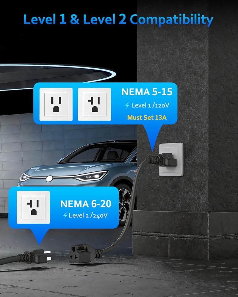 ⚡【الشحن في أي مكان وفي أي وقت】مصمم لتحقيق أقصى قدر من المرونة، يتميز شاحن eTimxon Level 1 & 2 EV بالتوافق مع قابس NEMA 5-15 و6-20. سواء كنت تقوم بالشحن في المرآب الخاص بك، أو في منزل أحد الأصدقاء، أو في فندق على جانب الطريق. قابس NEMA 6-20 لشحن المستوى 2 ev (240 فولت، 16 أمبير، 3.84 كيلو وات) ومحول NEMA 5-15 لشحن المستوى 1 ev (120 فولت، 13 أمبير، 1.44 كيلو وات) ملاحظة: وفقًا لمعايير السلامة الكهربائية في أمريكا الشمالية، عند استخدام قابس NEMA 5-15، تحتاج إلى ضبط التيار إلى 13 أمبير يدويًا لحماية كل من سيارتك وسيارتك النظام الكهربائي في المنزل