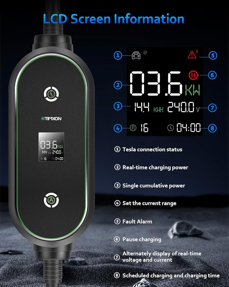 ⚡【شحن تيار وتأخير قابل للتعديل】 يتميز شاحن EV 16A هذا لـ Tesla بتيار قابل للتعديل بـ 5 مستويات (6A/8A/10A/13A/16A) ومؤقت تأخير ذكي لمدة 0.5-5 ساعات. سواء كنت تقوم بالشحن طوال الليل أو خارج ساعات الذروة، استمتع باستخدام أكثر ذكاءً للطاقة وتكاليف أقل وراحة تامة - مما يسمح لك بتحسين سرعة الشحن بناءً على احتياجاتك