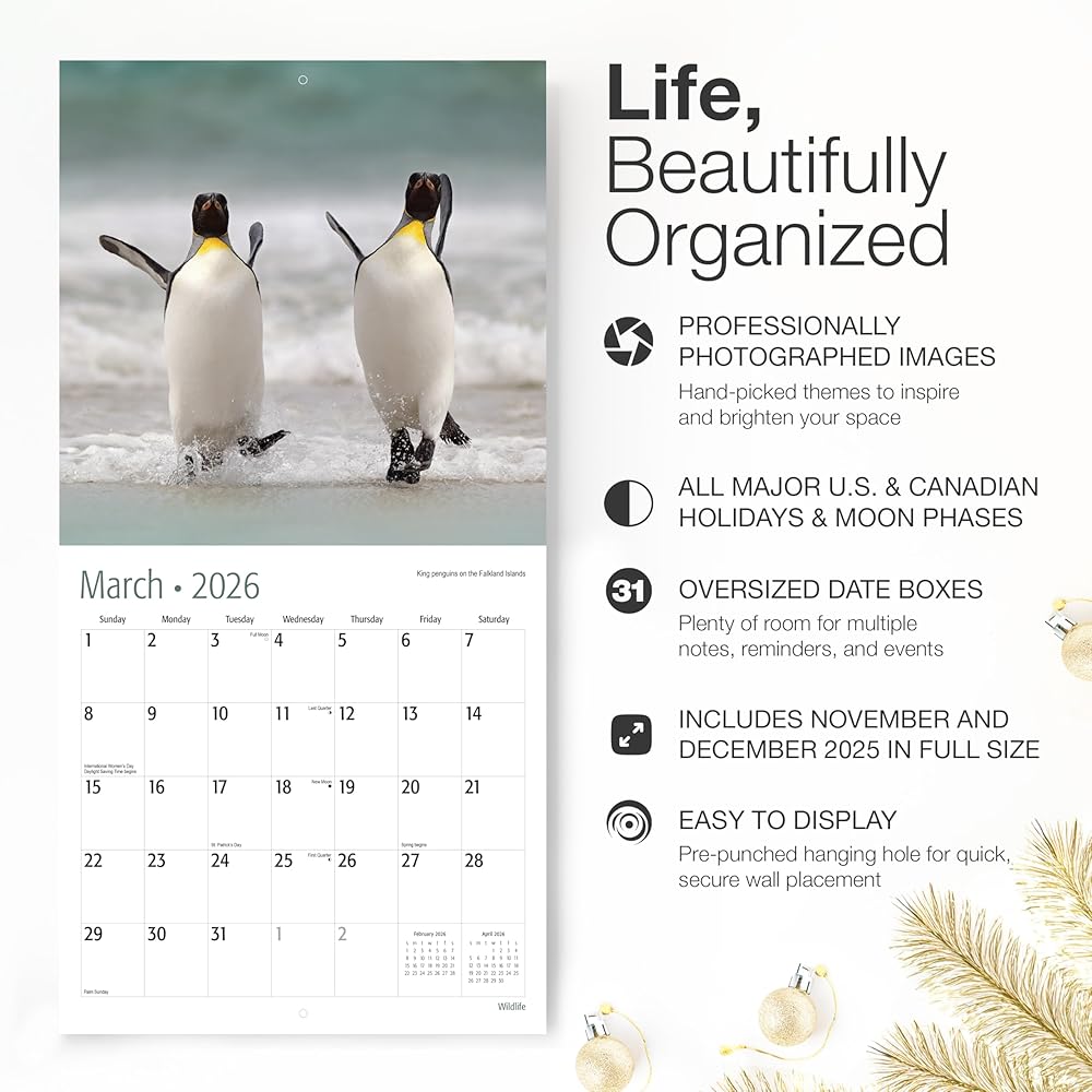 جودة فاخرة - تتم طباعة هذا التقويم باللغة الإنجليزية فقط على ورق سميك غير لامع يمنع نزيف الحبر ويقاوم التجعد أو التمزق. يضمن التصوير الفوتوغرافي عالي الدقة والربط المتين أن يبدو تقويم الحائط الخاص بك لعام 2026 جميلاً على مدار العام.