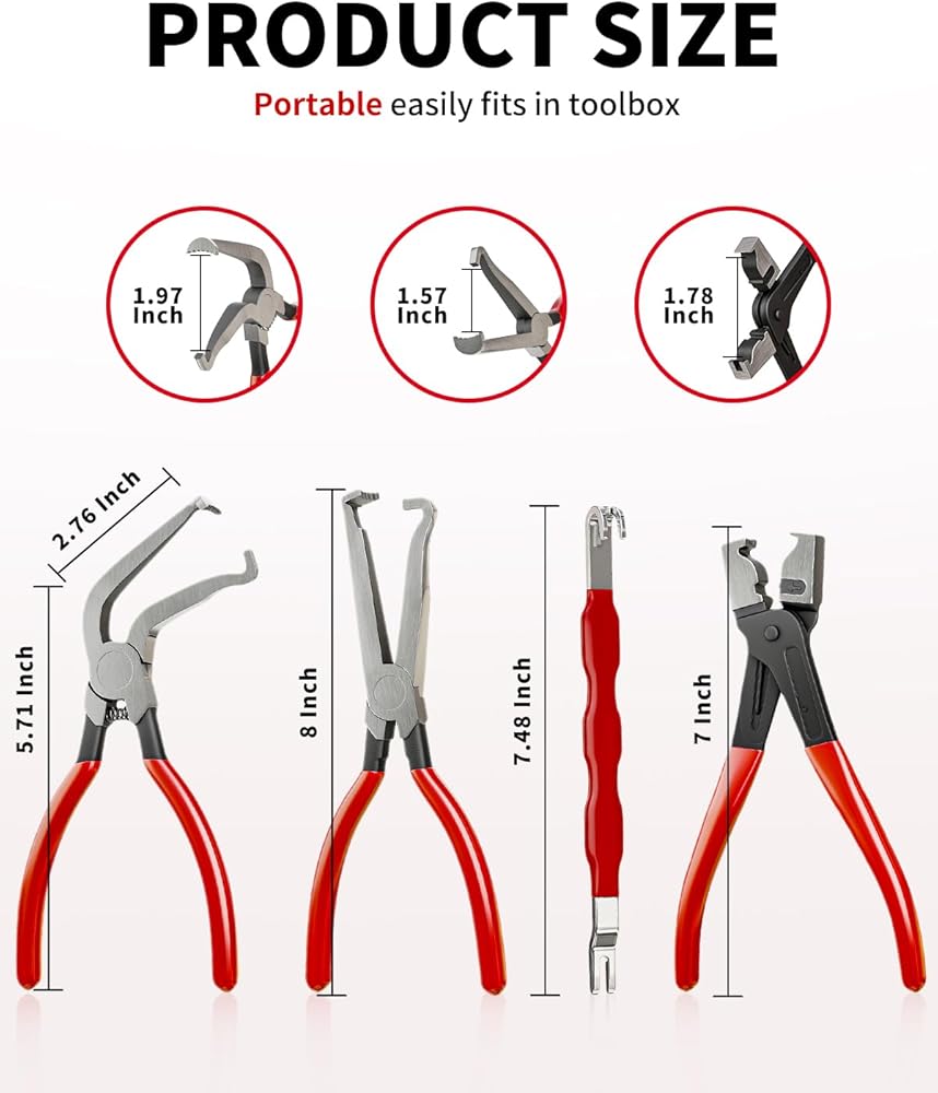 ما تحصل عليه: 4 قطع من كماشة فصل الكهرباء، المجموعة تتضمن: 1x كماشة فصل كهربائي برأس مستقيم، 1x كماشة فصل كهربائي برأس مائل، 1x كماشة مشبك خرطوم، 1x عتلة مزدوجة الأطراف، 1x دليل استخدام. إنها إضافة عملية لأي مجموعة أدوات للسيارات، مما يوفر كفاءة محسنة ويقلل من خطر إتلاف الموصلات الحساسة. مُستَحسَن
