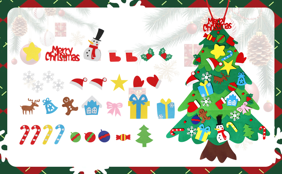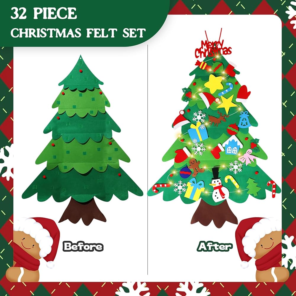 32 قطعة زينة قابلة للفصل - تأتي مع 32 قطعة زينة من اللباد الملون، مما يسمح للأطفال بالتزيين والإزالة وإعادة الديكور بحرية. مثالية لإثارة الإبداع ومتعة احتفالية لا نهاية لها.