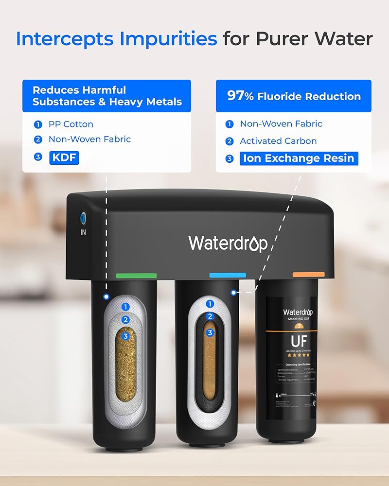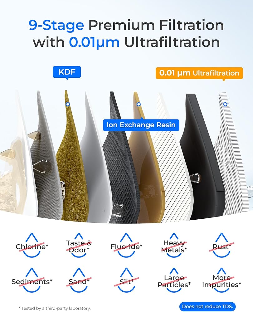 غشاء تصفية فائق 0.01 ميكرون. بما في ذلك معظم الكلور والطعم والرائحة، ويمتص الرصاص، والكلورامين، والفلورايد، والمعادن الثقيلة، والمركبات العضوية المتطايرة وأكثر من ذلك بكثير. بالإضافة إلى ذلك، لم يتم تصميم هذا النظام لإزالة TDS، وسيحتفظ بالمعادن مثل البوتاسيوم والكالسيوم والصوديوم والمغنيزيوم، وهي مفيدة لصحتك.