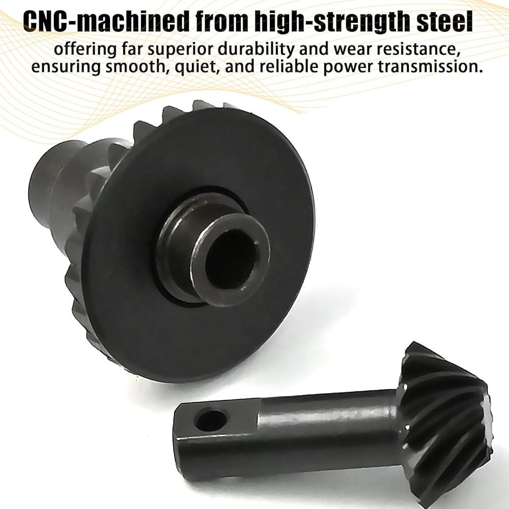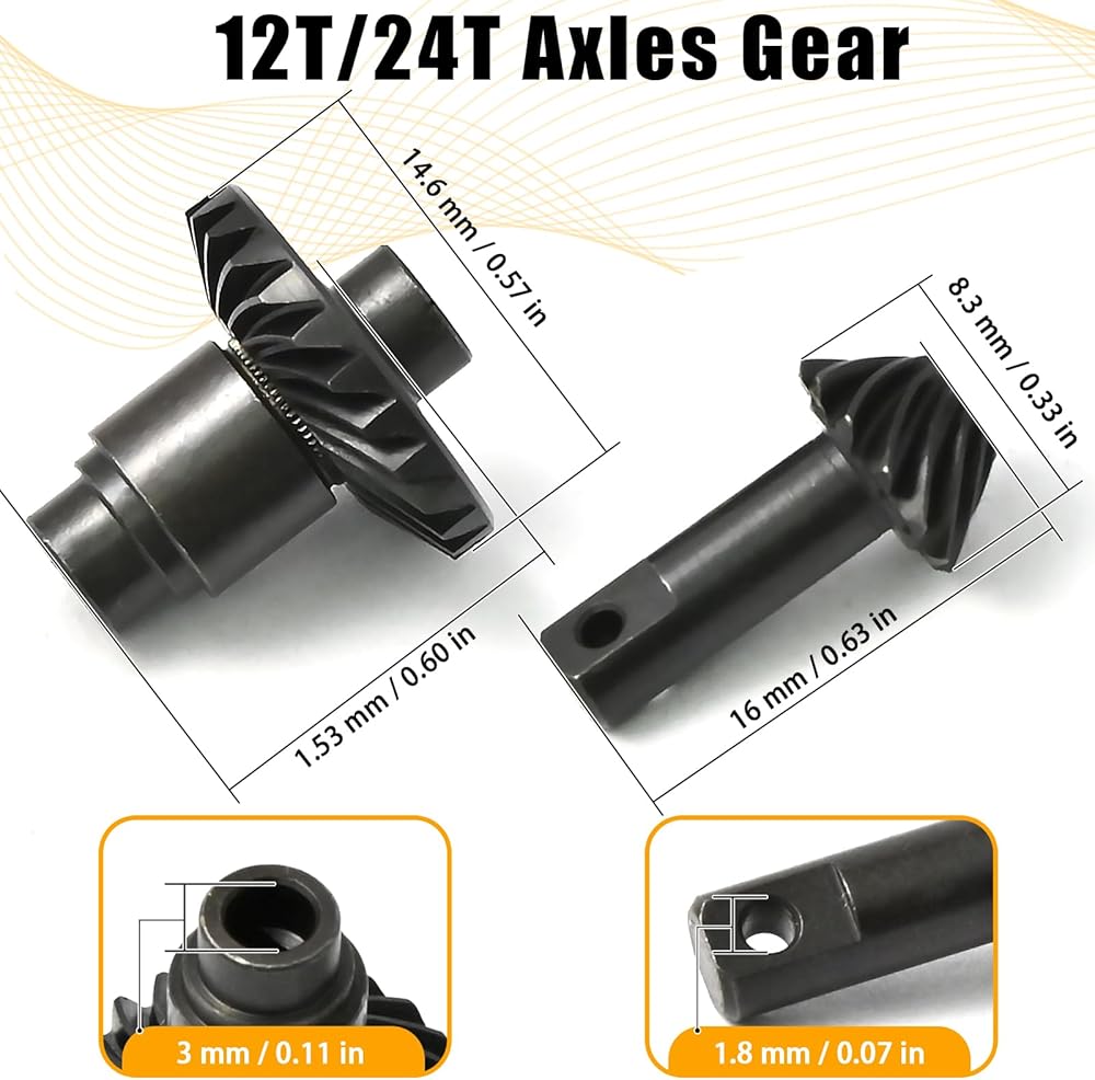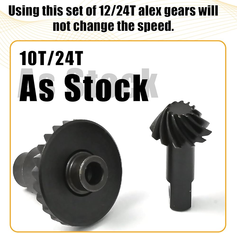 【Package Includes】The set includes 2 pieces steel gears (1x 24T for the front axle, 1x 10T for the rear axle), and the set provides a 16.7% underdrive to the rear axle. Please note: Grease and tools are not included.