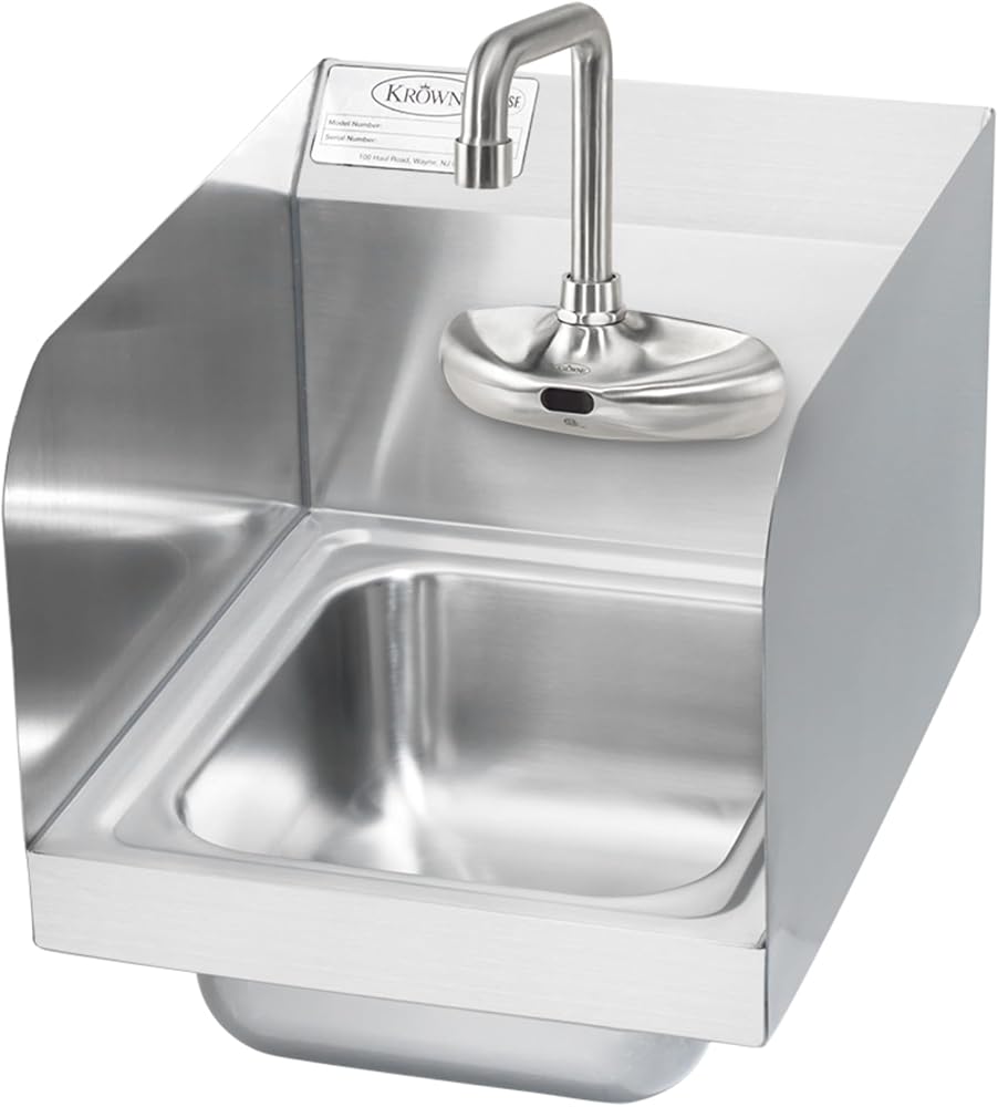 حوض يد Krowne HS-65، مثبت على الحائط، وعاء عميق 9 بوصة عرض × 11 بوصة عمق × 5 بوصة، صنبور إلكتروني OC 4 بوصة، صنبور مزدوج الانحناء 4-1/2 بوصة، رشاشات جانبية 7-3/4 بوصة، يشمل: وحدة التحكم وصمام الخلط الميكانيكي وخرطوم الإمداد