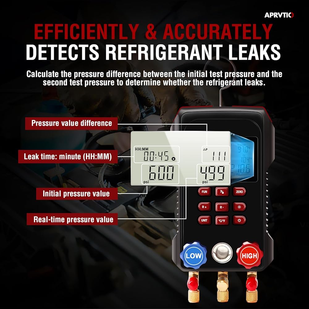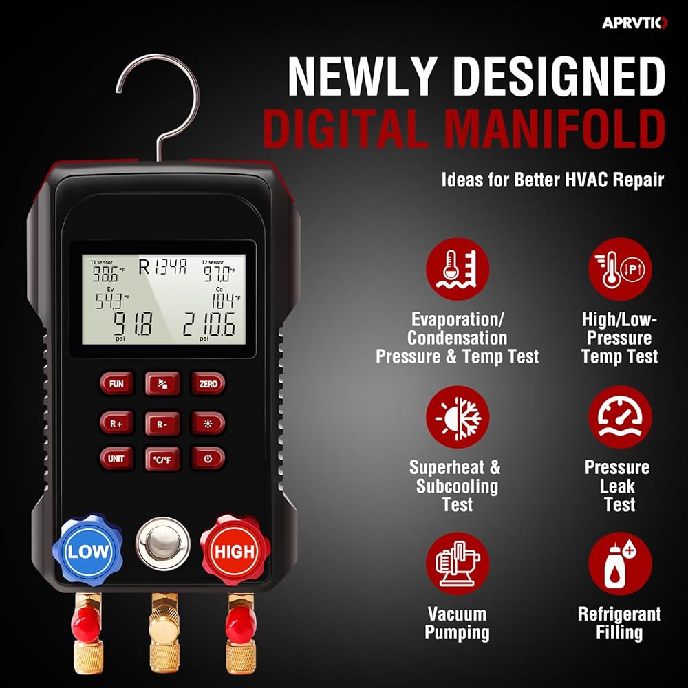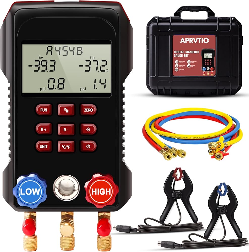 مقياس رقمي متعدد، مجموعة قياس التيار المتردد الرقمي مجموعة قياس نظام تبريد السيارات والتكييف من Aprvtio لمجموعة أدوات نظام التدفئة والتهوية وتكييف الهواء للسيارات R134a R22 R12 R454B