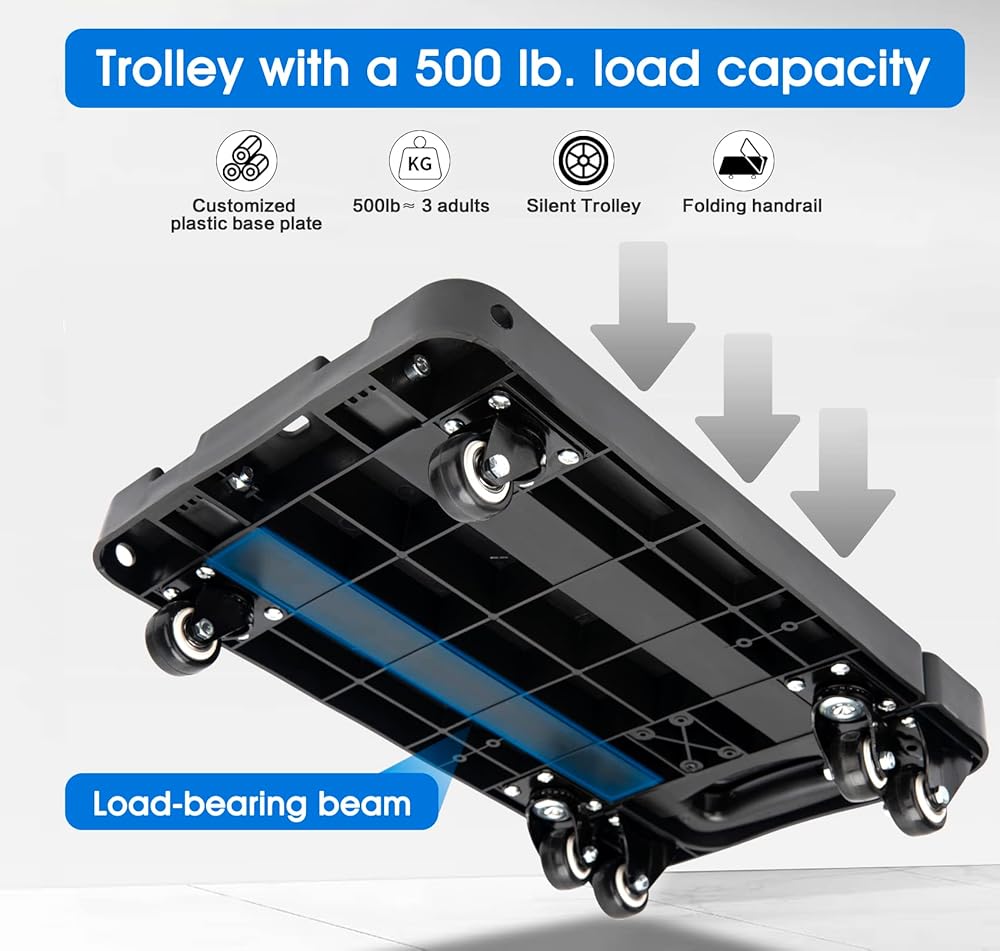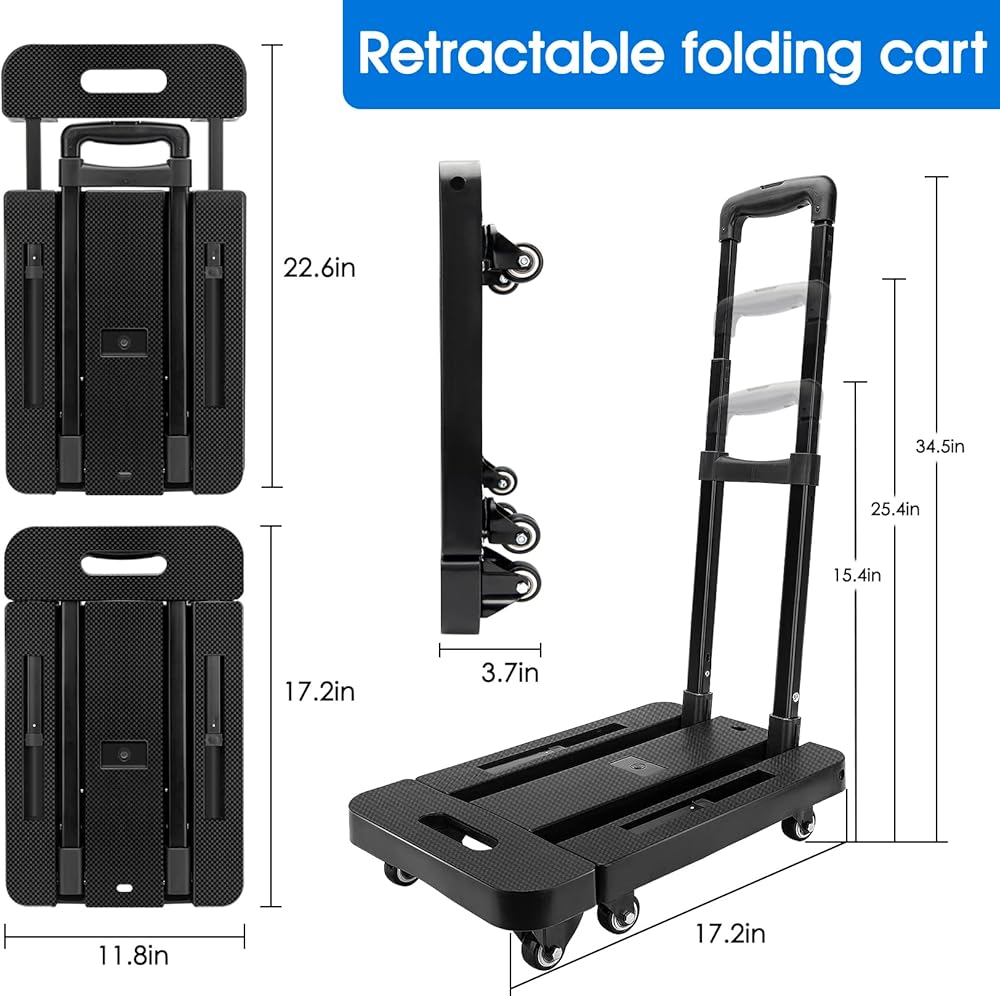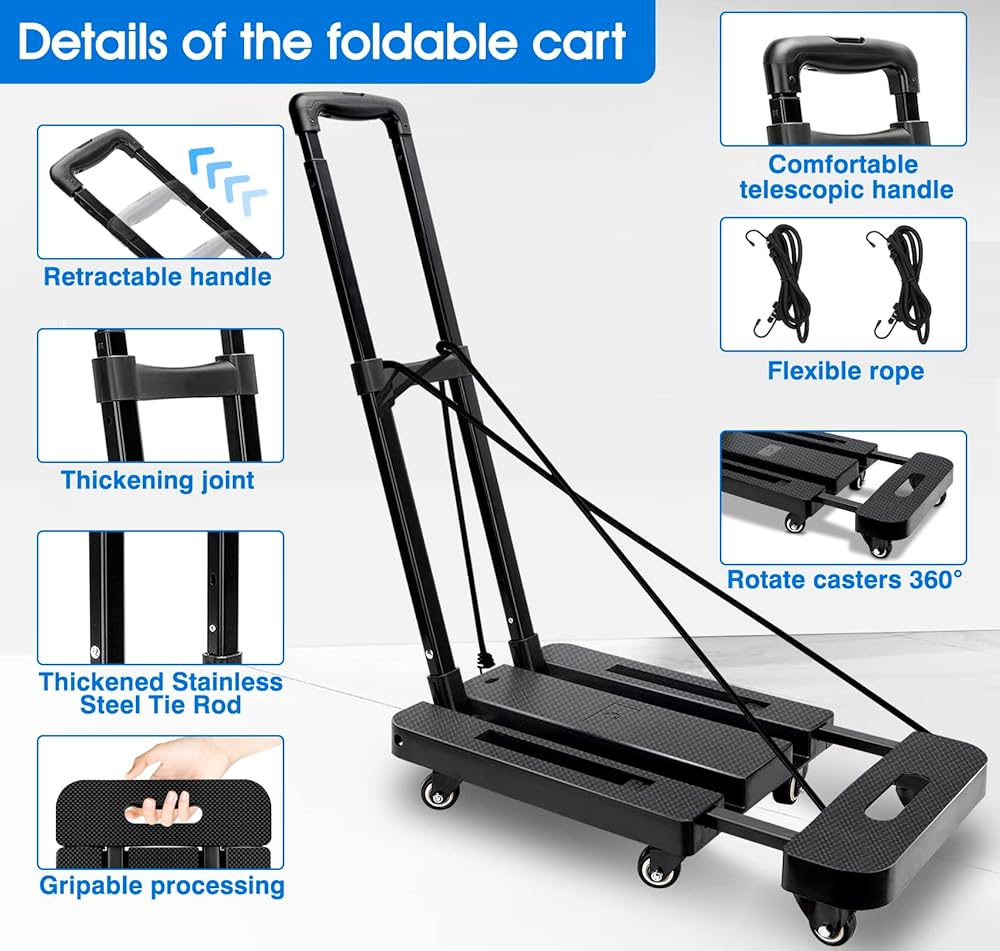 【لوحة قاعدة قابلة للتمدد】يمكن حمل عربة الأمتعة القابلة للطي بسهولة في الهواء الطلق، يبلغ قياسها 17 بوصة × 11 بوصة × 3.7 بوصة ويمكن تخزينها بسهولة في حقيبة السيارة أو حقيبة الظهر الشخصية. تم تصميم دمية الشاحنة اليدوية بلوحة قاعدة سميكة قابلة للتعديل، يمكنك تمديد اللوحة الأساسية إلى 57.44 سم.