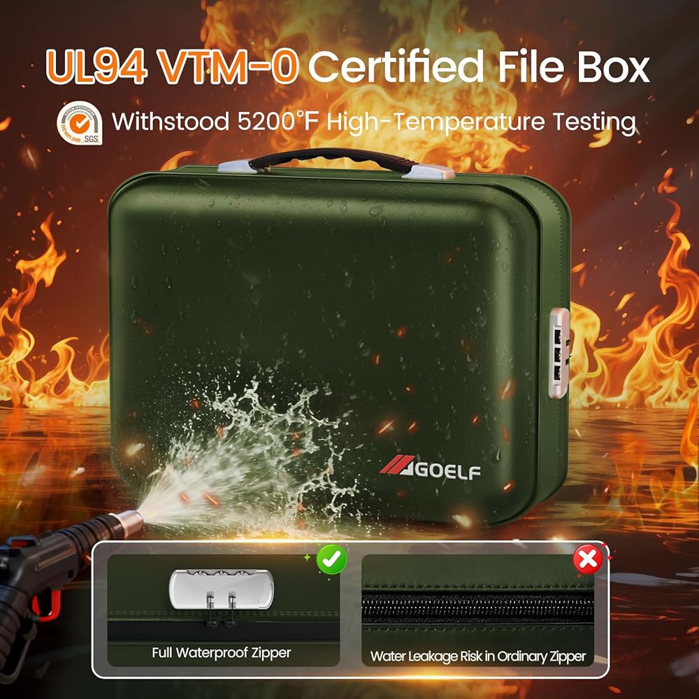 【صندوق مستندات مقاوم للحريق معتمد من UL-94 VTM-0 】: يتميز صندوق المستندات المضاد للحريق من GOELF بألياف زجاجية مطلية بالسيليكون وبنية رقائق الألومنيوم السميكة، معتمدة وفقًا لمعايير UL-94 VTM-0 لتحمل لهب درجة الحرارة العالية 5200 درجة فهرنهايت. يعمل هيكل صندوق الملفات المقاوم للحريق المكون من 8 طبقات والسحاب المخصص المقاوم للماء على منع النيران الشديدة والأمطار الغزيرة بشكل فعال، مما يوفر حماية ضرورية لشهادات ميلادك وجوازات السفر والنقود ومحركات الأقراص الصلبة وغيرها من الأشياء الثمينة - مما يمكّنك من البقاء هادئًا أثناء حالات الطوارئ