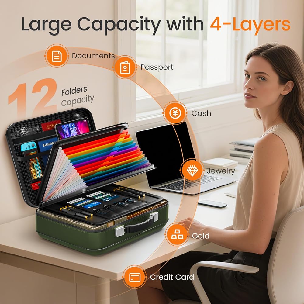 【تنظيم علمي ذو سعة كبيرة】: يتميز بتصميم محسن مع مساحة واسعة، ويبلغ حجم صندوق المستندات المقاوم للحريق 15.98 بوصة × 11.61 بوصة × 5.70 بوصة. يشتمل منظم الملفات الآمن على جيبين شبكيين صغيرين، وجيب شبكي كبير، و12 فتحة للبطاقات، وجيبين، و4 جيوب لمحرك أقراص USB، و4 فتحات للأقلام، و12 مجلد ملفات أكورديون، وحجرة رئيسية واسعة. أشرطة الاحتفاظ بالمجلدات الداخلية تساعدك قم بتصنيف العناصر وتخزينها بشكل أنيق، سواء كانت المستندات العائلية المهمة لمنظم المستندات المهمة أو عقود الأعمال المكتبية، كل شيء يبقى منظمًا