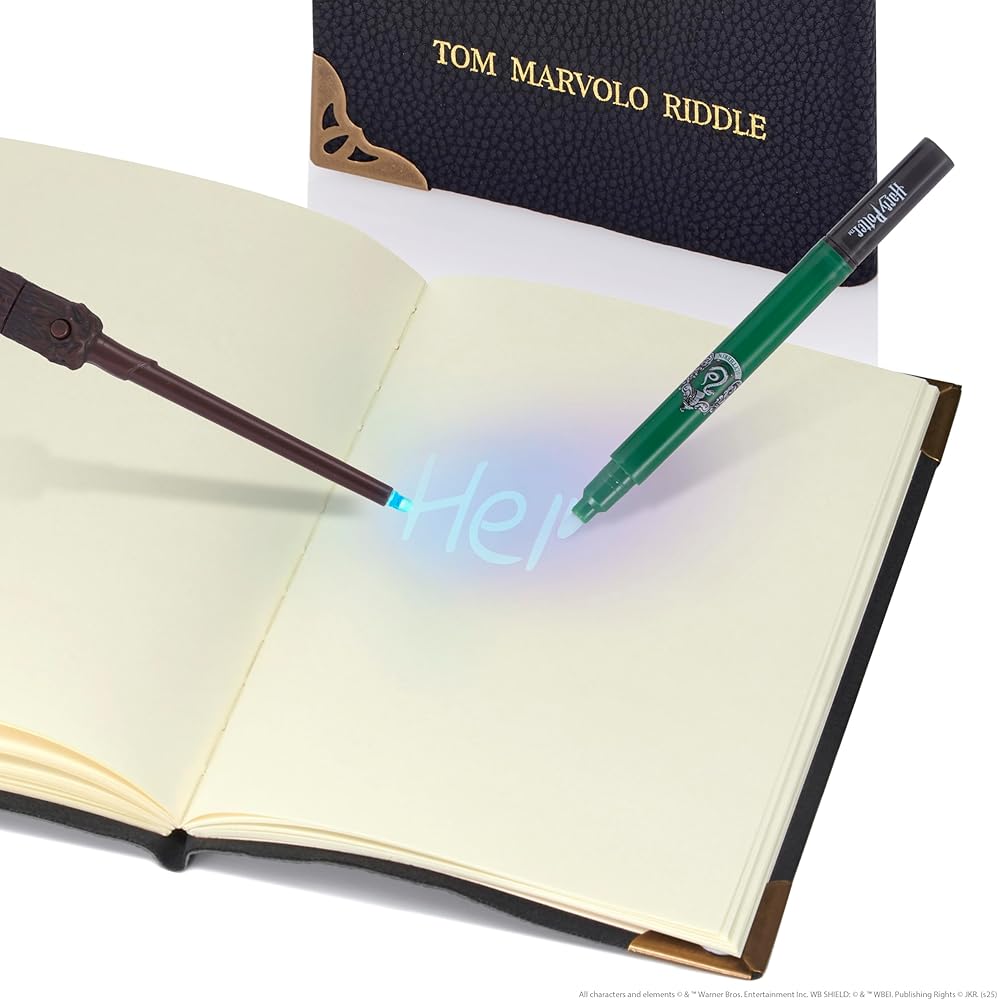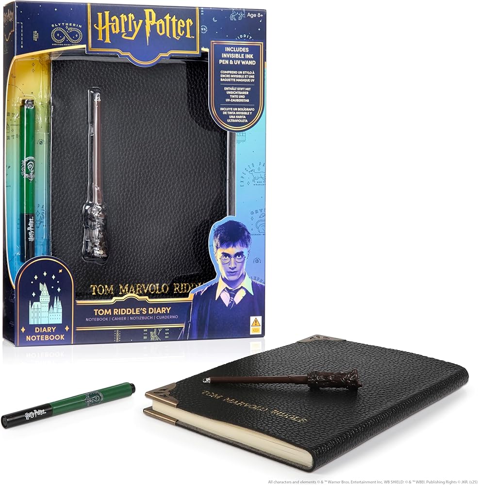 HARRY POTTER: TOM RIDDLE'S DIARY SET - While at Hogwarts, Tom Marvolo Riddle used his diary notebook to invisibly store all of his secrets and memories. Now you can do the same! This all new diary set - well, actually it's a notebook set - allows Harry Potter fans to leave mysterious notes and messages, just like the ones seen in Harry Potter and the Chamber of Secrets. Tom Riddle's diary may look like a Muggle-made book, but it was turned into a Horcrux by the young Lord Voldemort. Magical properties are to communicate with anyone who writes in its pages. SUPERIOR QUALITY & FUNCTIONALITY: Leather effect notebook with Tom Marvolo Riddle printed on the front. Filled with 150 sheets of A5 plain paper can be used with Muggles and No-Maj pens and pencils. Kids and adults alike love the superior quality of this official Harry Potter collectable diary. Get ready to go back to school with the only official Tom Riddle Diary with magical UV Harry Potter Wand. WIZARDING WORLD LICENSED: The Wizarding World Collection features unique toys and gifts inspired by the Harry Potter and Fantastic Beasts film franchises that are authorized and licensed by Warner Bros. INCLUDES: Tom Riddle's Diary Notebook, Slytherin House Invisible Ink Pen, Harry Potter Mini UV Wand.