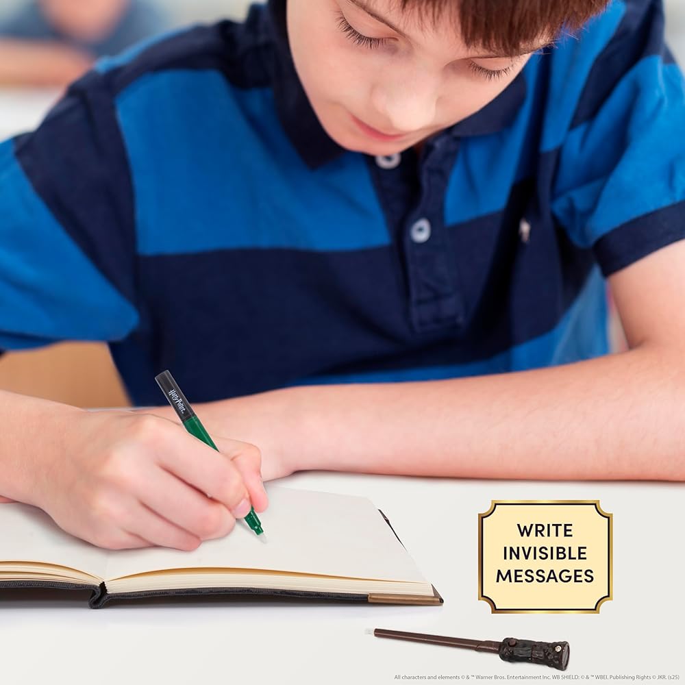 WRITE A SECRET MESSAGE using the Slytherin House invisible ink pen. The writing will remain invisible except when illuminated by the miniature wand's UV light. The ultimate secrecy companion for your magical journey!