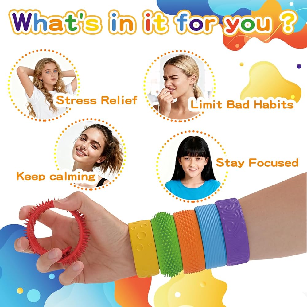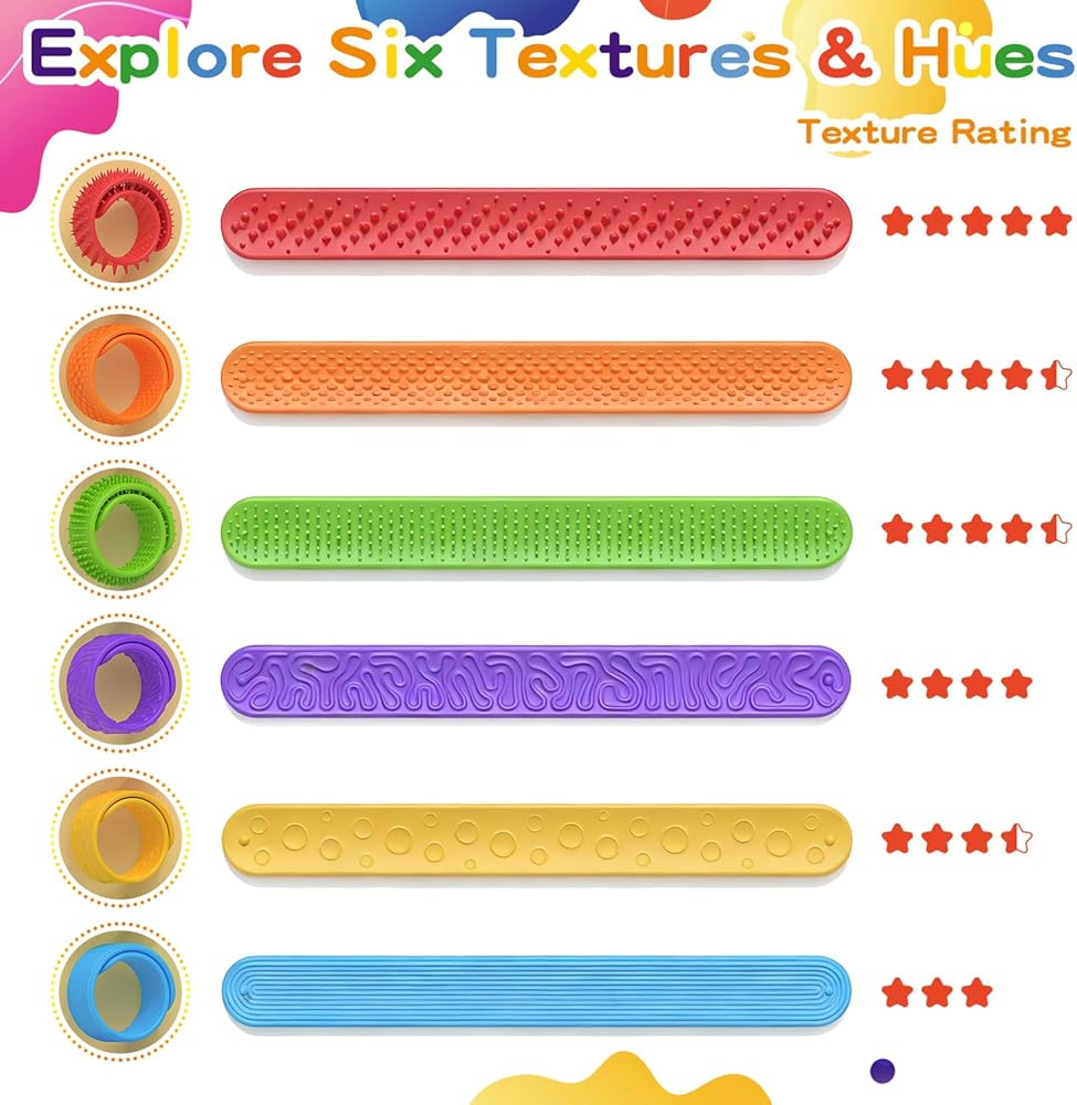 • 【أساور فيدجيت سلاب مزخرفة للأطفال】هل تبحث عن لعبة حسية ممتعة وقابلة للارتداء؟ توفر هذه الأساور الناعمة والمزخرفة مدخلات لمسية لطيفة ومهدئة - مثالية لتهدئة الأيدي المشغولة وتخفيف العقول المضطربة. تشتمل كل مجموعة على ستة أساور مصممة بشكل فريد، كل منها بملمس مميز يوفر مستوى مختلف من التحفيز الحسي، حتى تتمكن من تلبية الاحتياجات الفريدة لكل طفل.