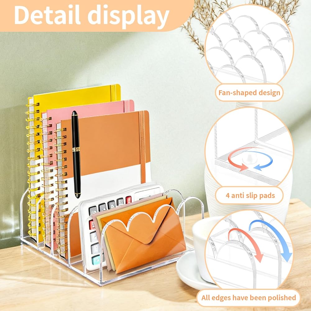 High Quality:This mail organizer for desk is made of high-quality acrylic, sturdy and durable, making it safer to use.The smooth edges and fan-shaped curve design add a touch of elegance to your workspace organizer.