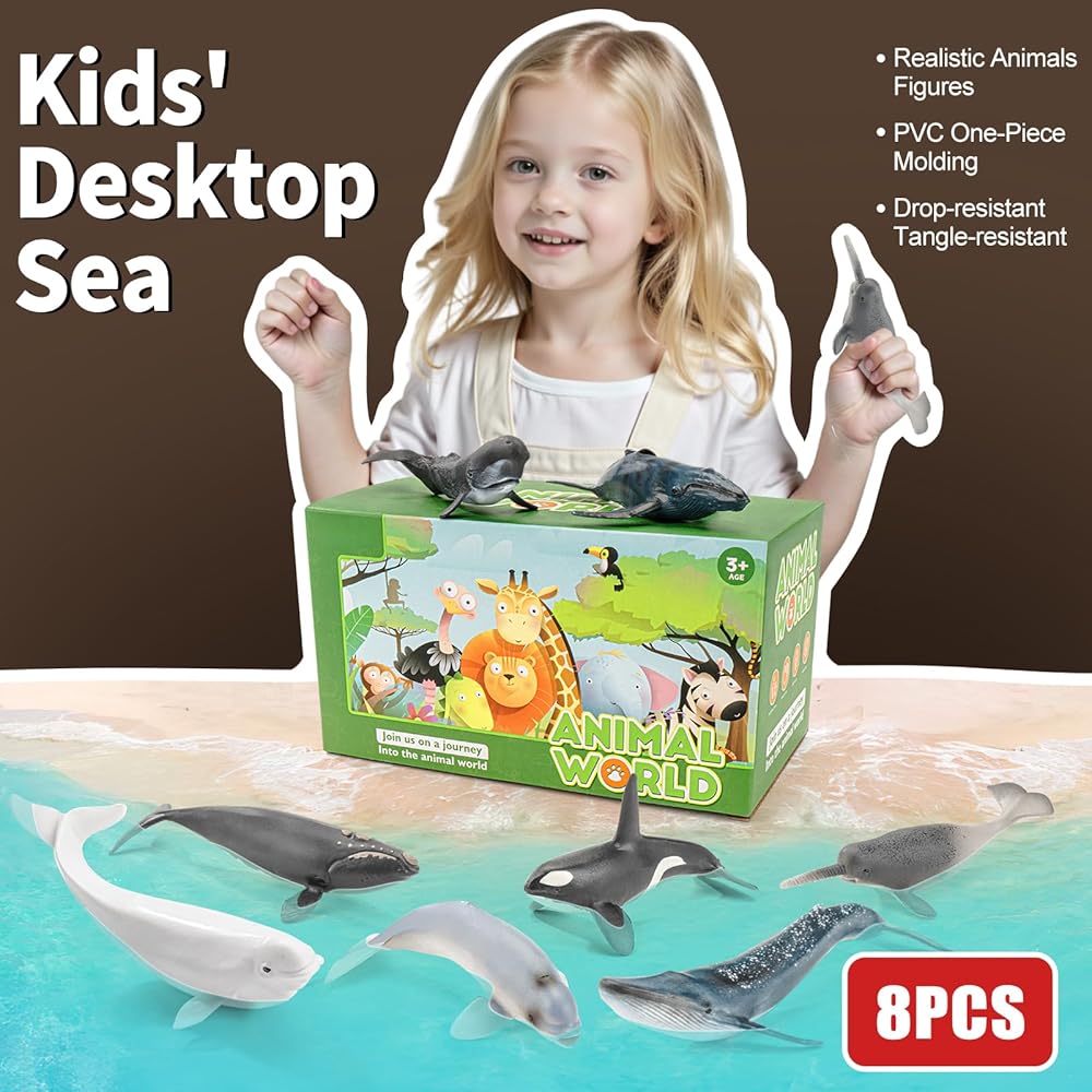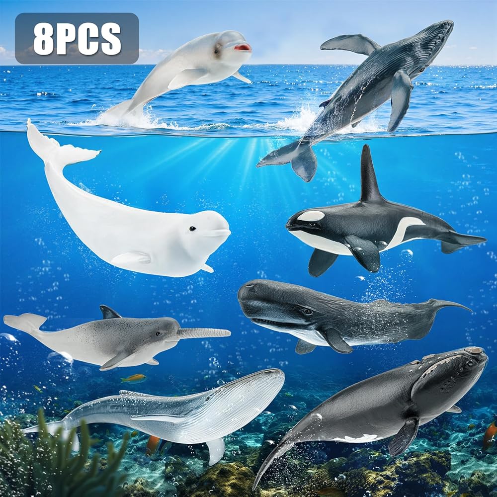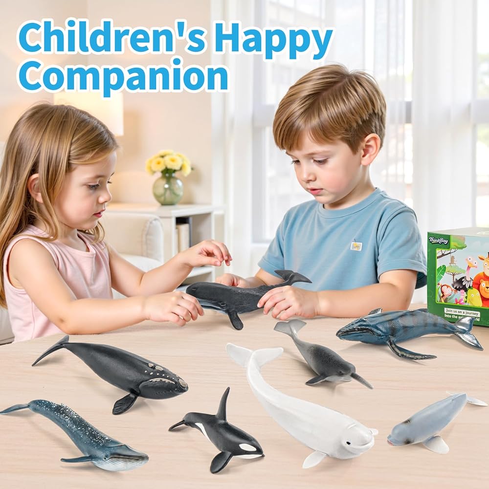 8 قطع من تماثيل الحوت: ألعاب حوت ثينكباي للأطفال تشمل الحوت الأزرق، الحوت الأحدب، ناروال، حوت كاشالوت، حوت شمال الأطلسي الأيمن، أوركا، الحوت الرمادي، الحوت الأبيض. انها على غرار الحيتان الحقيقية.