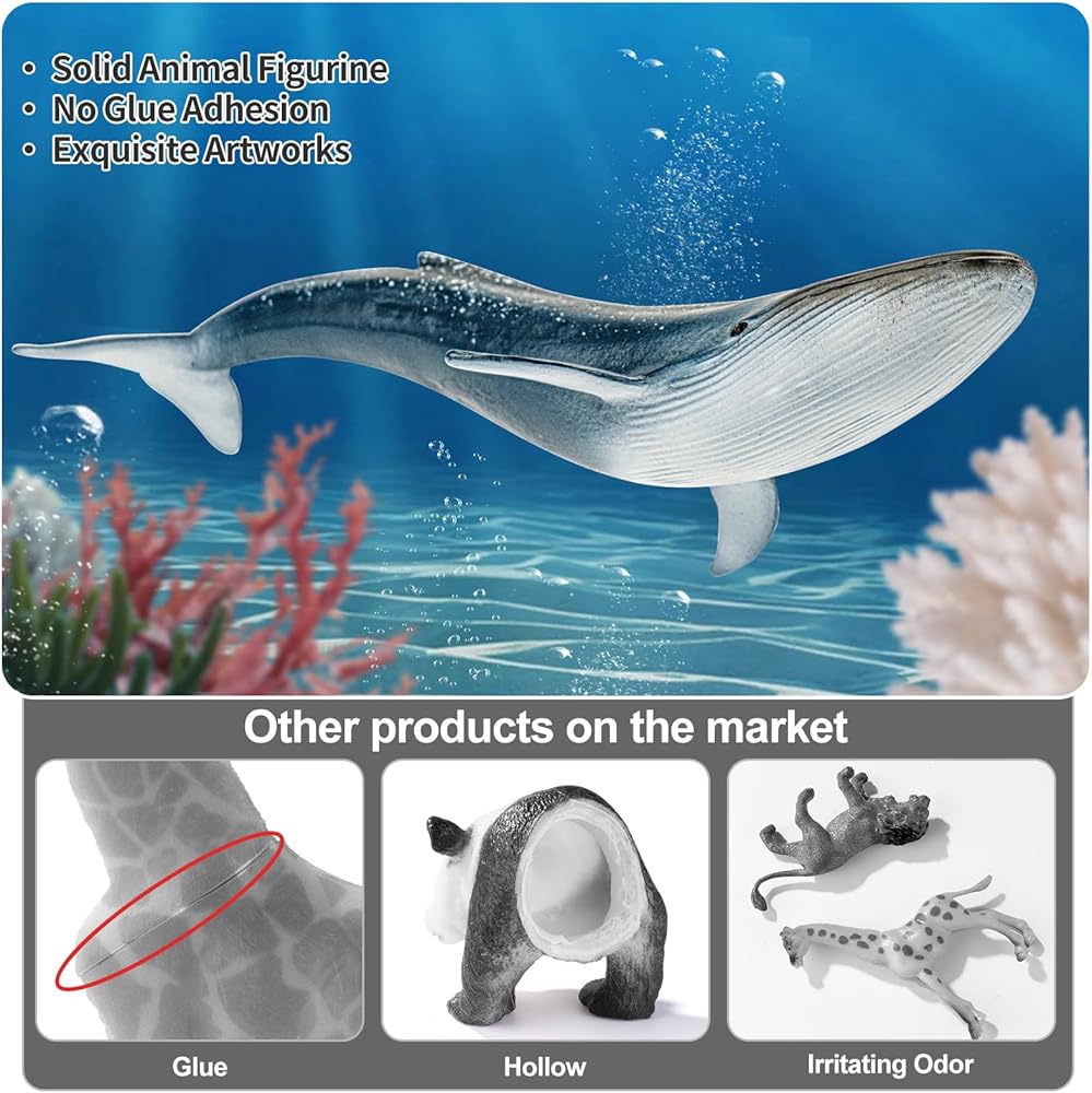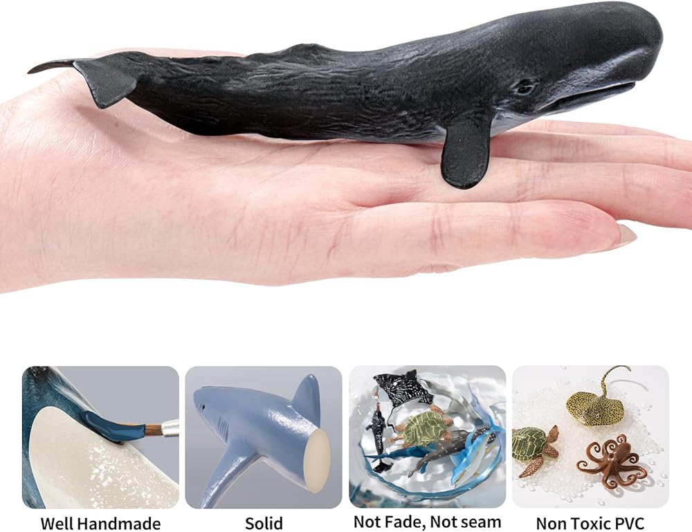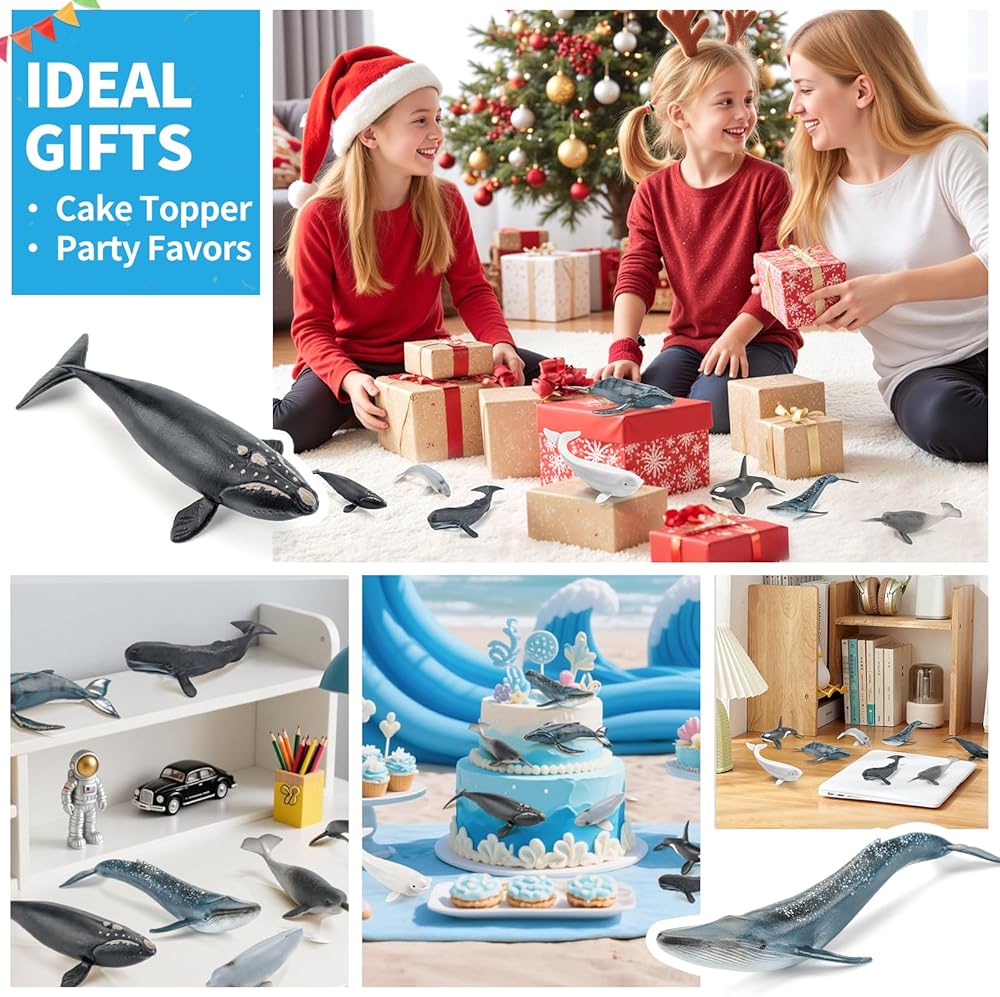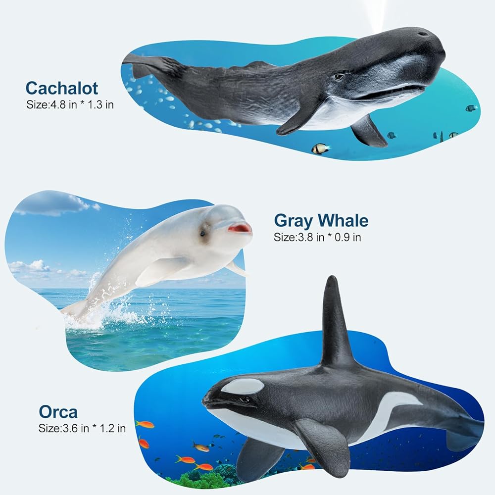 8 قطع من تماثيل الحوت: ألعاب حوت ثينكباي للأطفال تشمل الحوت الأزرق، الحوت الأحدب، ناروال، حوت كاشالوت، حوت شمال الأطلسي الأيمن، أوركا، الحوت الرمادي، الحوت الأبيض. انها على غرار الحيتان الحقيقية.