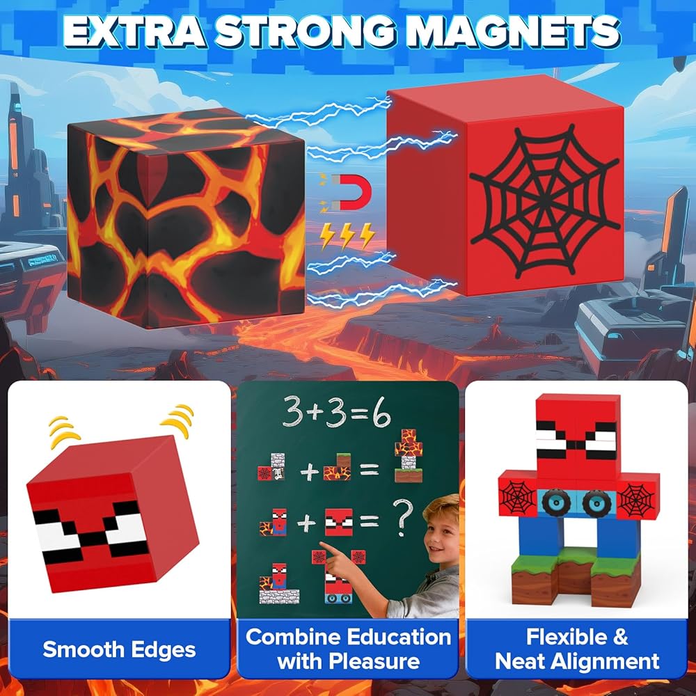 【مرحلة إبداعية متعددة الأسطح】تتحرر هذه الكتل المغناطيسية من قيود المشهد الثابت للمكعبات العادية، بتصميمها المغناطيسي القوي، وتلتصق بأمان ليس فقط بعلبة الحديد المتضمنة، ولكن أيضًا على أي سطح حديدي: أبواب الثلاجة، وأبواب المرآب، وأسطح الطاولات، وما إلى ذلك. أنماط نابضة بالحياة تثير الخيال - بناء القلاع والحروف وأي شيء - دون أي قيود. تضيف "نقرة" الامتصاص المتعة، وتحول الأسطح اليومية إلى مناطق لعب فورية للإبداع أثناء التنقل