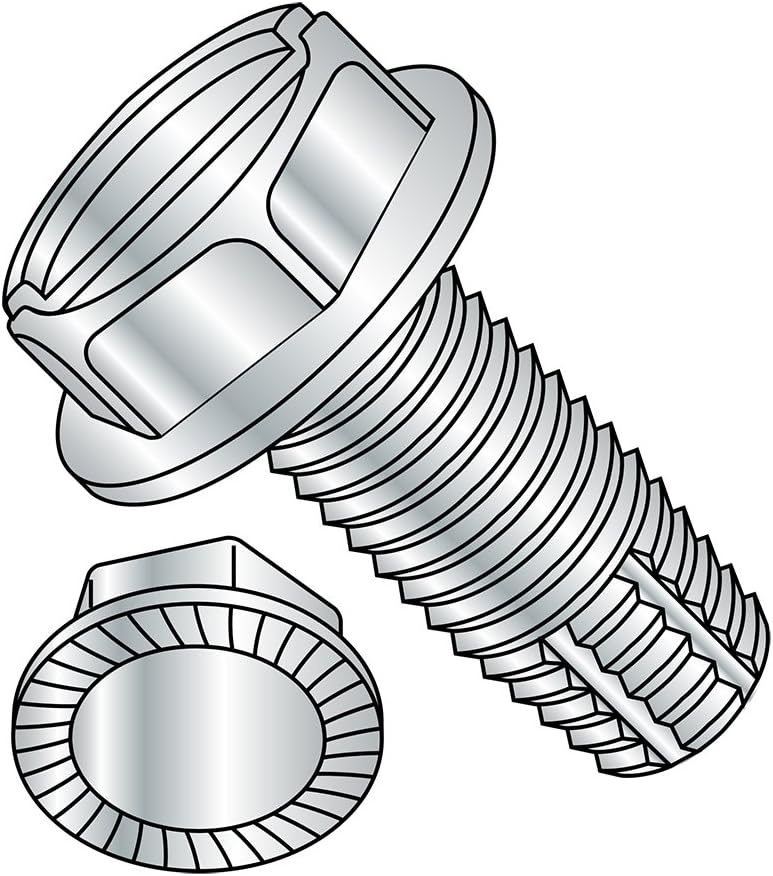 The steel thread cutting screw has a zinc plating, a Type F point style, and a serrated hex washer head with a slotted drive. The type F point is suitable for heavy gauge sheet metal, aluminum, cast iron, brass, and plastic. The screw has machine screw threads that taper down to a blunt point with multiple cutting edges and chip cavities. Steel is often used in applications where strength is the primary consideration. The zinc plating offers corrosion resistance and has a reflective appearance. The hex washer head has six flat sides that a wrench can grip to turn from the side, enabling use when there is no space above the head for a screwdriver. The serrated flange acts like a washer to increase the fastener's bearing surface and distribute the clamping force over a larger area, providing a grip that resists loosening. The slotted drive has a linear slot for use with a flat-blade driver.