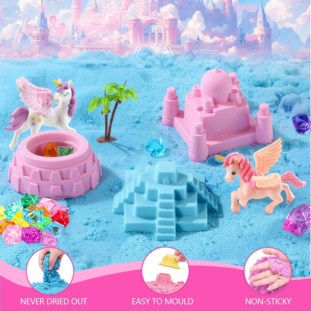 صندوق يونيكورن الحسي للفتيات، طقم فن الرمل السحري للأولاد والبنات مع صندوق الرمل، قوالب القلعة، 2.18 رطل 3 ألوان رمل، أفضل مجموعات ألعاب يونيكورن هدية عيد الميلاد للأطفال من عمر 3 سنوات فما فوق
