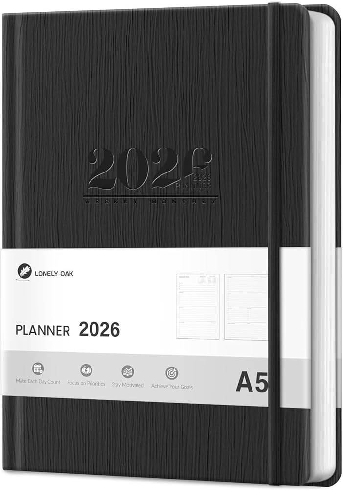 مخطط 2026، مخططات أسبوعية وشهرية، تقويم يومي من الجلد الصناعي 2026 مخطط، جدول أعمال 12 شهرًا من يناير إلى ديسمبر، مجلة تعقب العادات ذات الغلاف الصلب 5.75 بوصة × 8.4 بوصة (أسود)