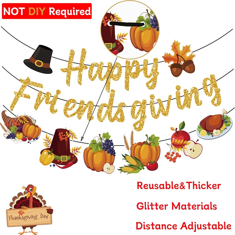 • READY TO USE FOR FRIENDSGIVING DECORATIONS PARTY:All the glitter Happy Friendsgiving is pre-assembled, it is only need your a few minutes to find a good place to hang it,No DIY Required. And Friendsgiving banner is very easy to fold