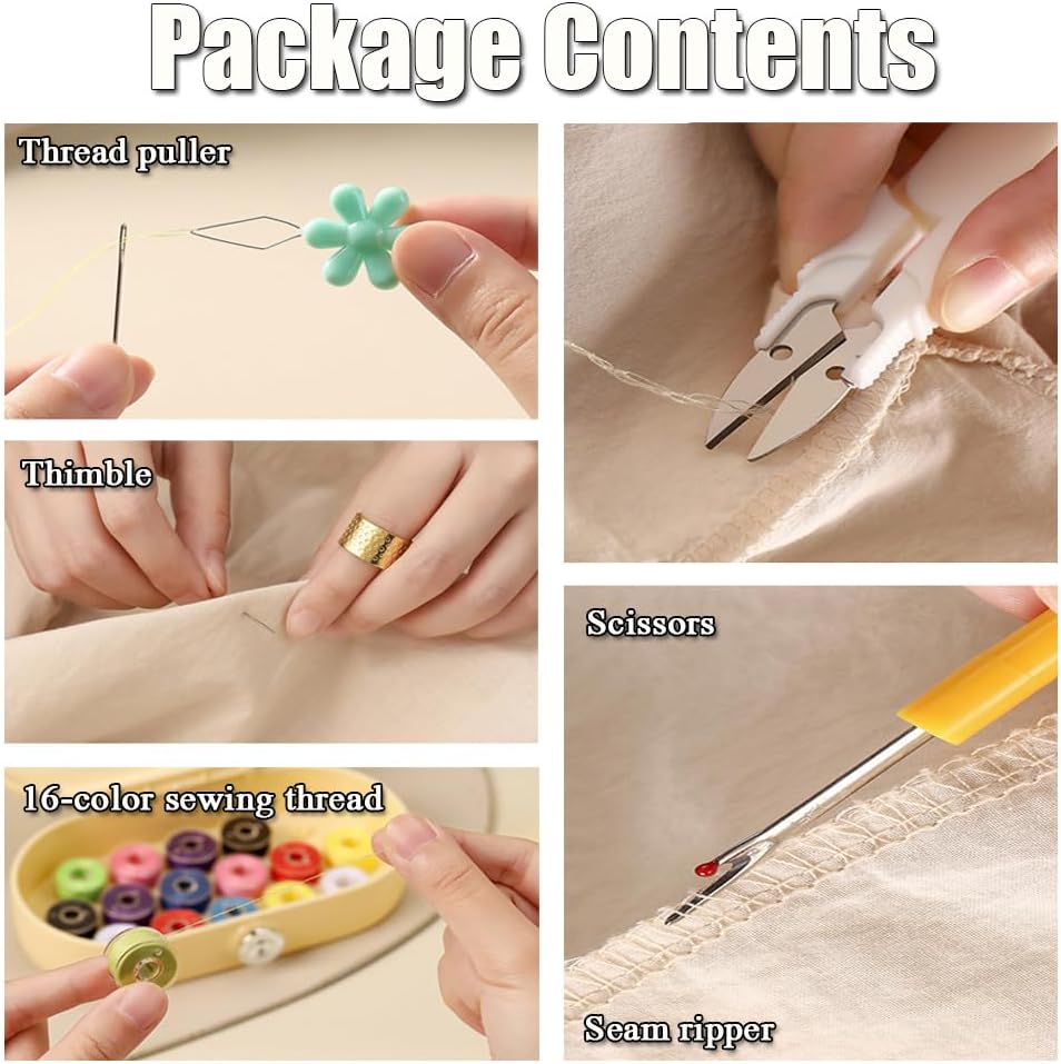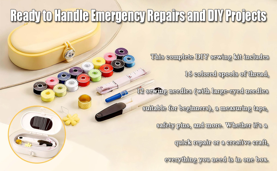 🛠️ حل الخياطة الشامل كن مستعدًا لأي شيء بتشكيلة ضخمة. تشتمل مجموعة الخياطة الكاملة التي يمكنك صنعها بنفسك على 16 بكرة خيط ملونة، و12 إبرة خياطة (مع إبر كبيرة مناسبة للمبتدئين)، وشريط قياس، ودبابيس أمان، والمزيد. كل ما تحتاجه للإصلاحات السريعة أو الحرف الإبداعية موجود في صندوق واحد