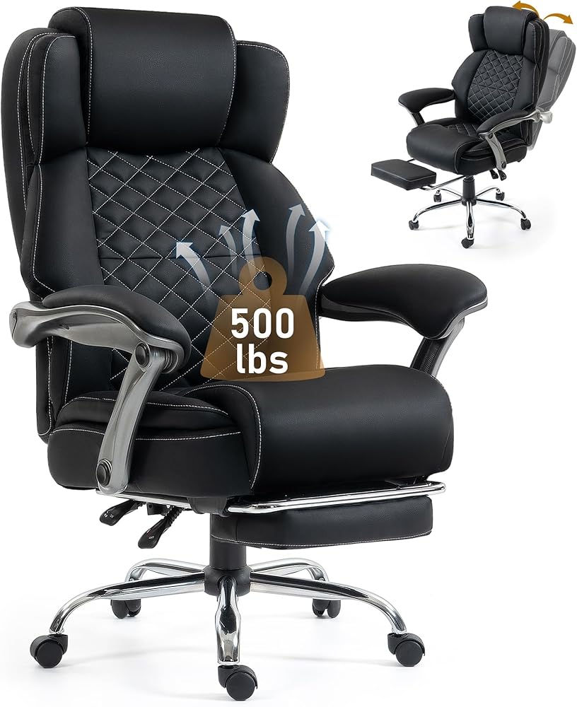 DYHOME كرسي مكتب مستلق بوزن 500 رطل مع مسند للقدمين، كراسي مكتب مكتب مريحة للمنزل التنفيذي، كرسي كمبيوتر عالي الظهر قابل للتعديل، وسادة مقعد أكثر سمكًا، كرسي ألعاب كبير وطويل ناعم من البولي يوريثان، أسود