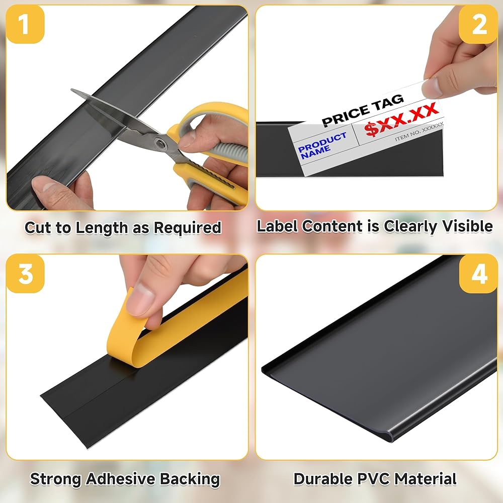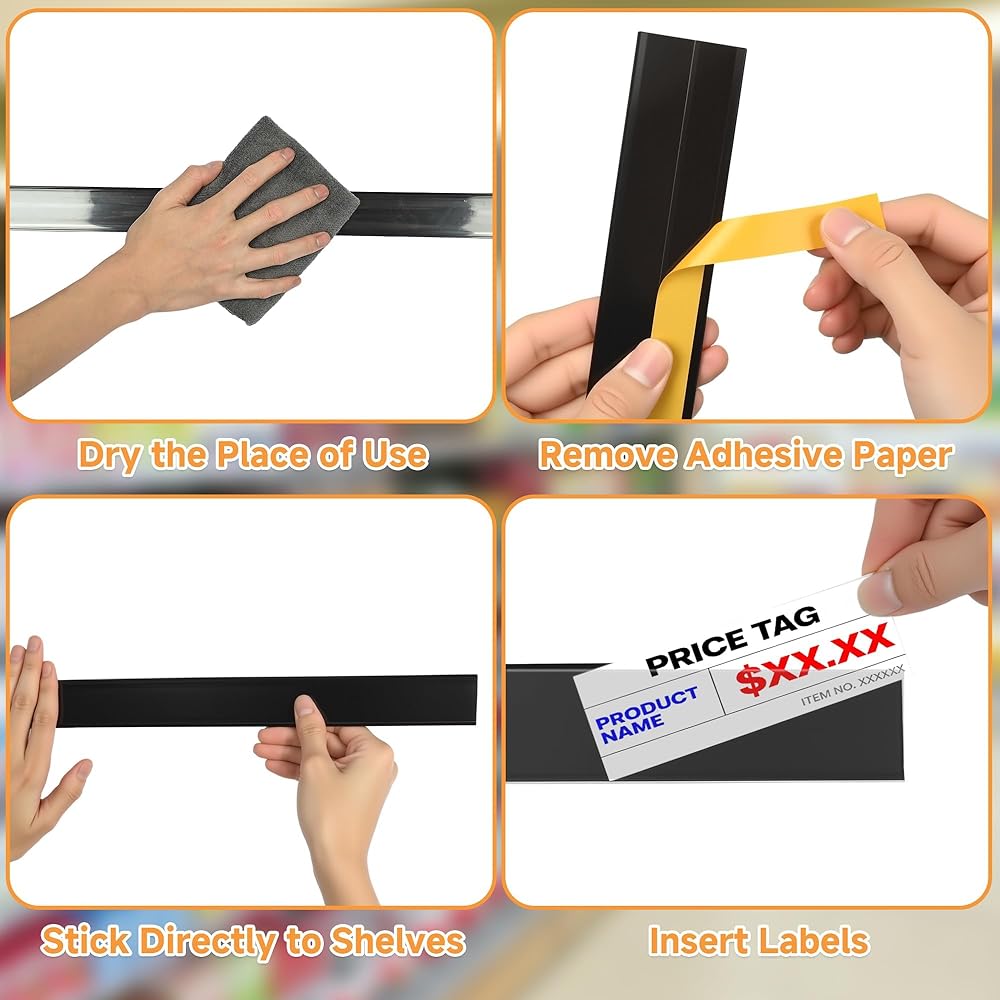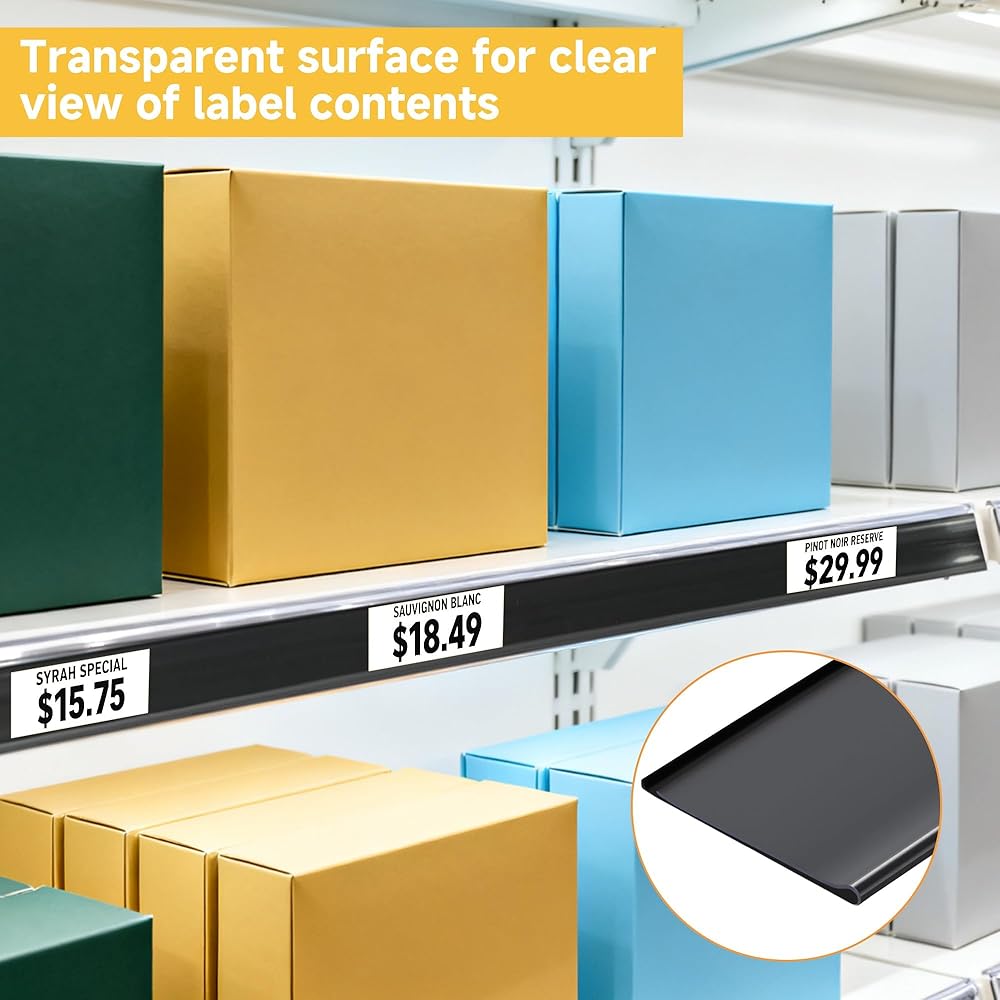 سهولة التركيب: قم ببساطة بتوصيل حاملات الملصقات على الأسطح المسطحة النظيفة. يمكن إدخال ورق الملصق الأبيض وإزالته بحرية، ويمكن مسحه بقطعة قماش مبللة لإعادة الاستخدام، مما يسمح بسهولة إضافة أو تغيير بطاقات الأسعار وغيرها من المعلومات.