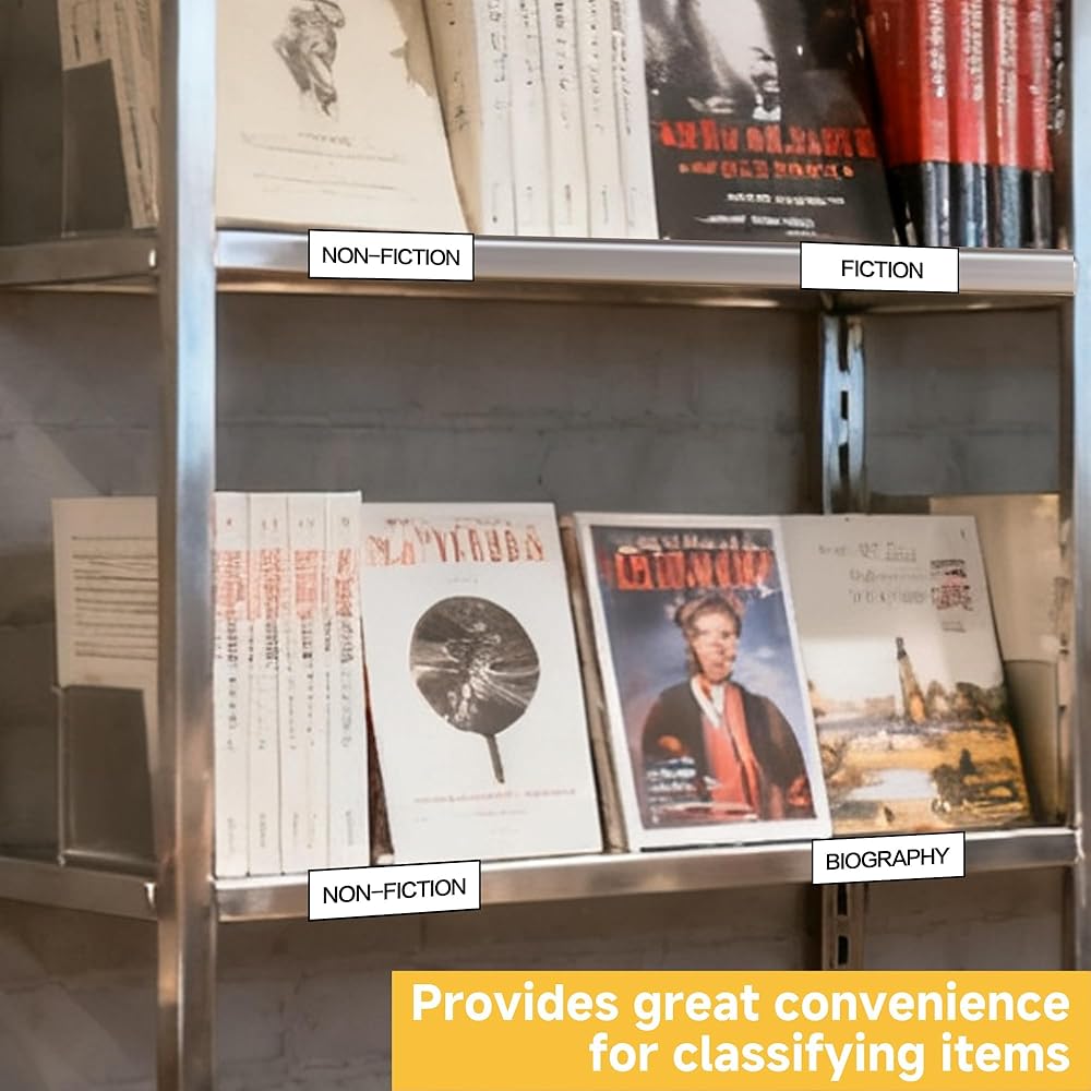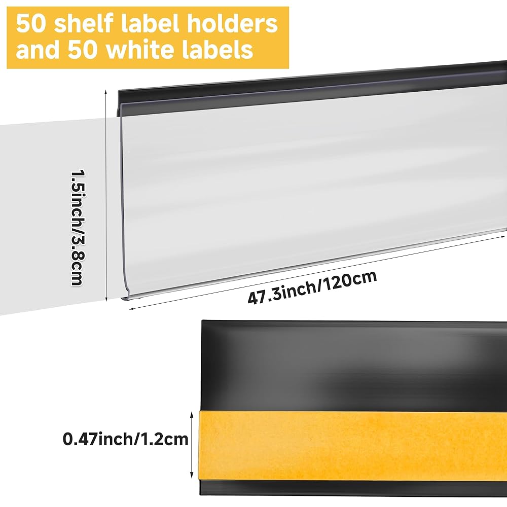 مواصفات المنتج: تتضمن 50 قطعة من حامل ملصقات الرف مقاس 1.5 بوصة × 48 بوصة و50 ورقة ملصق بيضاء، مقطوعة إلى الطول المطلوب حسب الحاجة. توفير كمية كافية لتلبية احتياجات العمل والحياة اليومية لعرض أنواع مختلفة من الملصقات