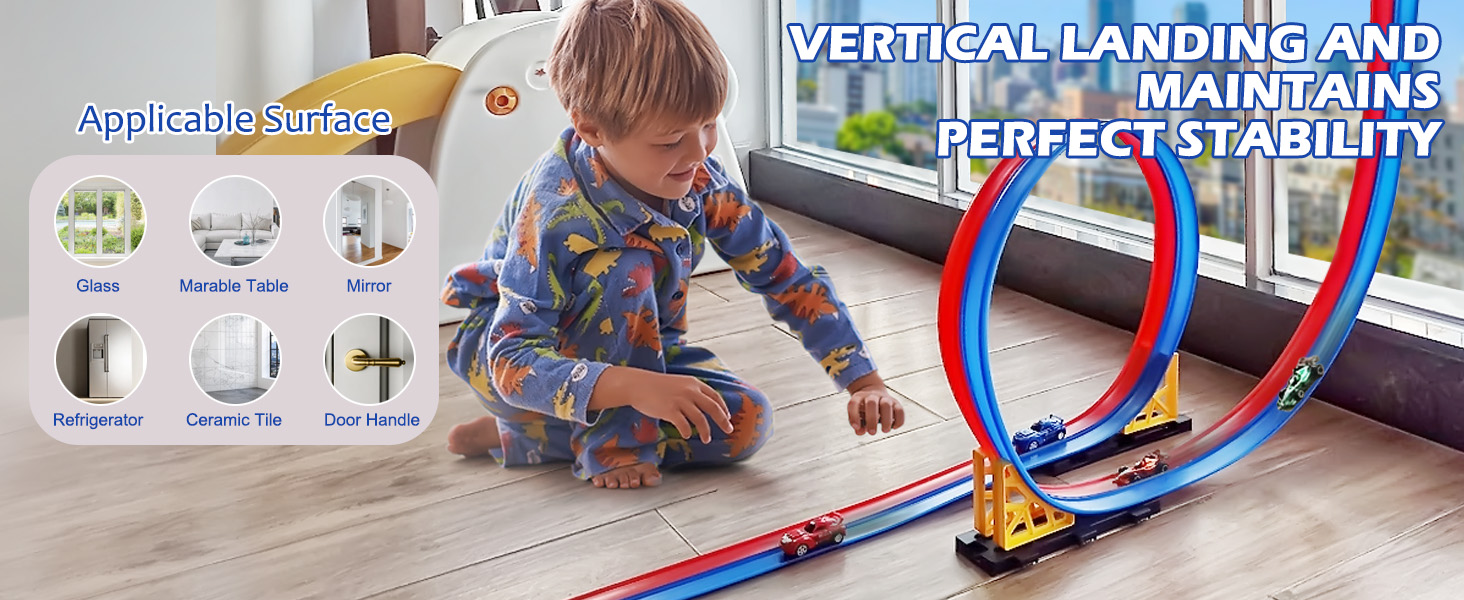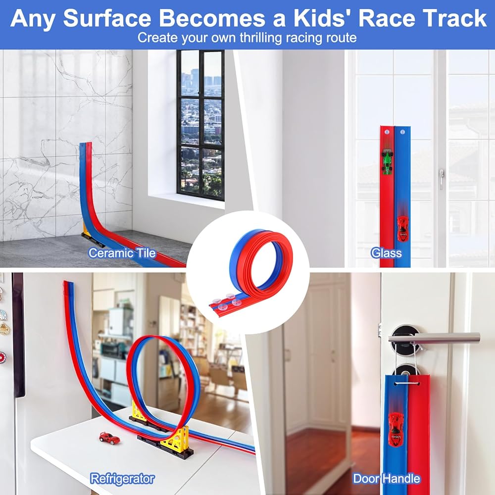 【متعة سباق لا نهاية لها، في أي مكان تذهب إليه】مصمم للأطفال من سن 3 سنوات فما فوق، يتيح مسار سيارة السباق المرن بطول 15 قدمًا مع أكواب الشفط للأطفال إنشاء مسارات على أحواض الاستحمام والنوافذ والبلاط وحتى الثلاجات! قل وداعًا لحلبات السباق المسطحة المملة - الآن يمكن للمتسابقين الصغار أن يتسابقوا بالسيارات على الجدران والسلالم ومقاعد الحديقة الناعمة للاستمتاع بتجربة لعب جديدة ومثيرة.