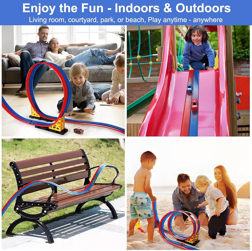【مثالي للمغامرات الداخلية والخارجية】 من أرضيات غرفة المعيشة إلى سباقات الفناء الخلفي، وأيام الشاطئ، ومواعيد اللعب في الحديقة، هذا المسار مثالي لمتعة لا نهاية لها في أي مكان. تصميمها المقاوم للماء يجعلها رائعة للعب في الماء، وحجمها الصغير يضمن سهولة تعبئتها للرحلات العائلية والحفلات.