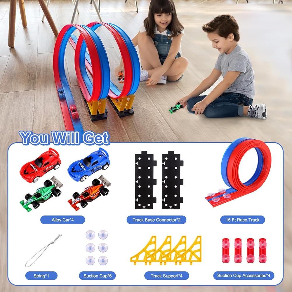 مسار سيارة سباق مرن للأطفال - منحدر قابل للانحناء بطول 15 قدمًا مع أكواب شفط - مسار سيارة قابل للطي للأطفال متوافق مع سيارات دييكاست 1:64 - عيد الميلاد للأولاد والبنات من سن 3 سنوات فما فوق
