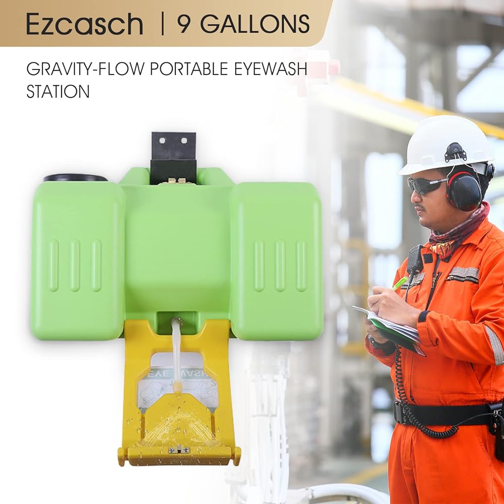 محطة غسل العين المحمولة Ezcasch سعة 9 جالون معتمدة من OSHA مع علامة محطة واحدة وعلامتي فحص، تدفق الجاذبية المثبت على الحائط في الداخل والخارج، محطة غسيل العين القابلة لإعادة الملء سعة 35 لترًا شديدة التحمل