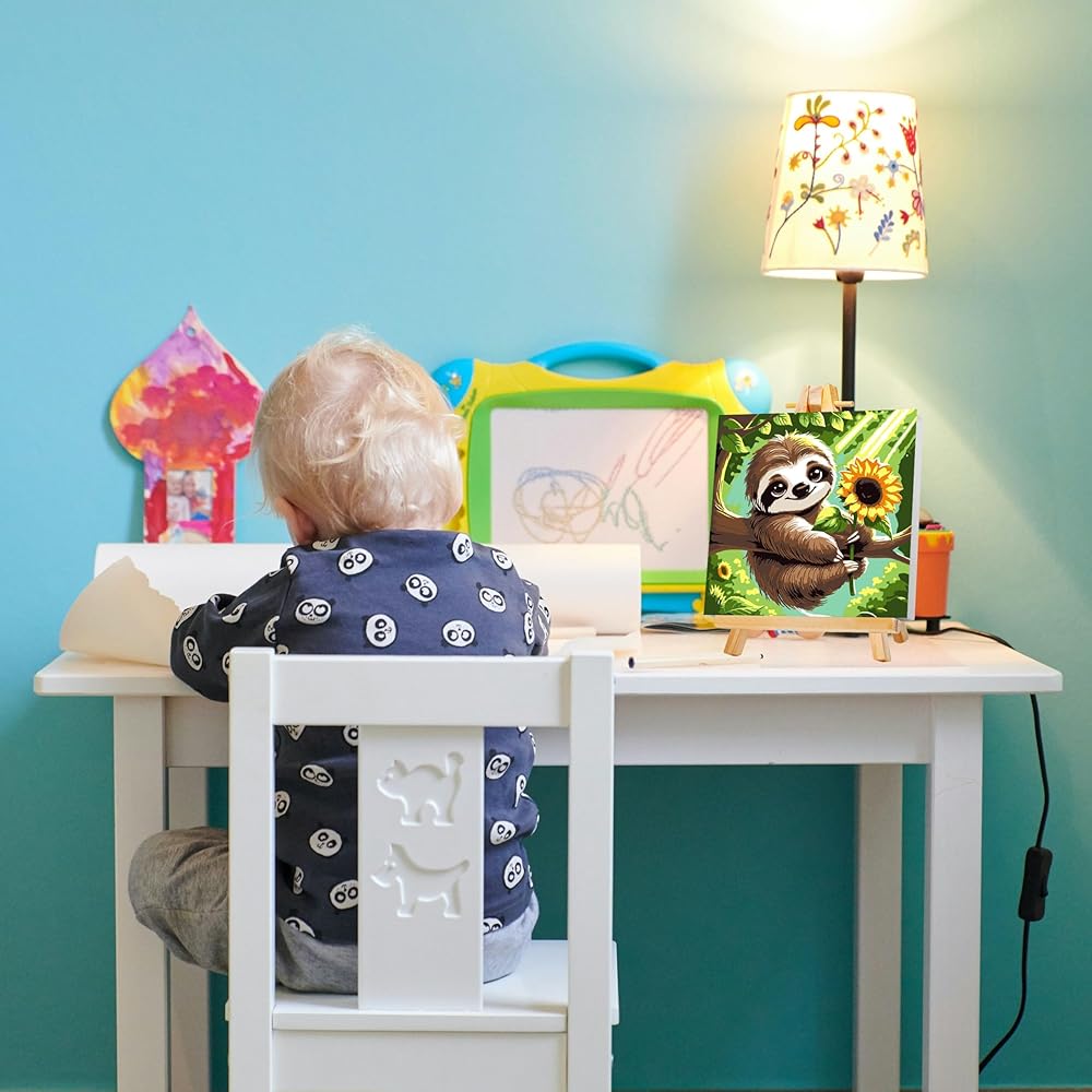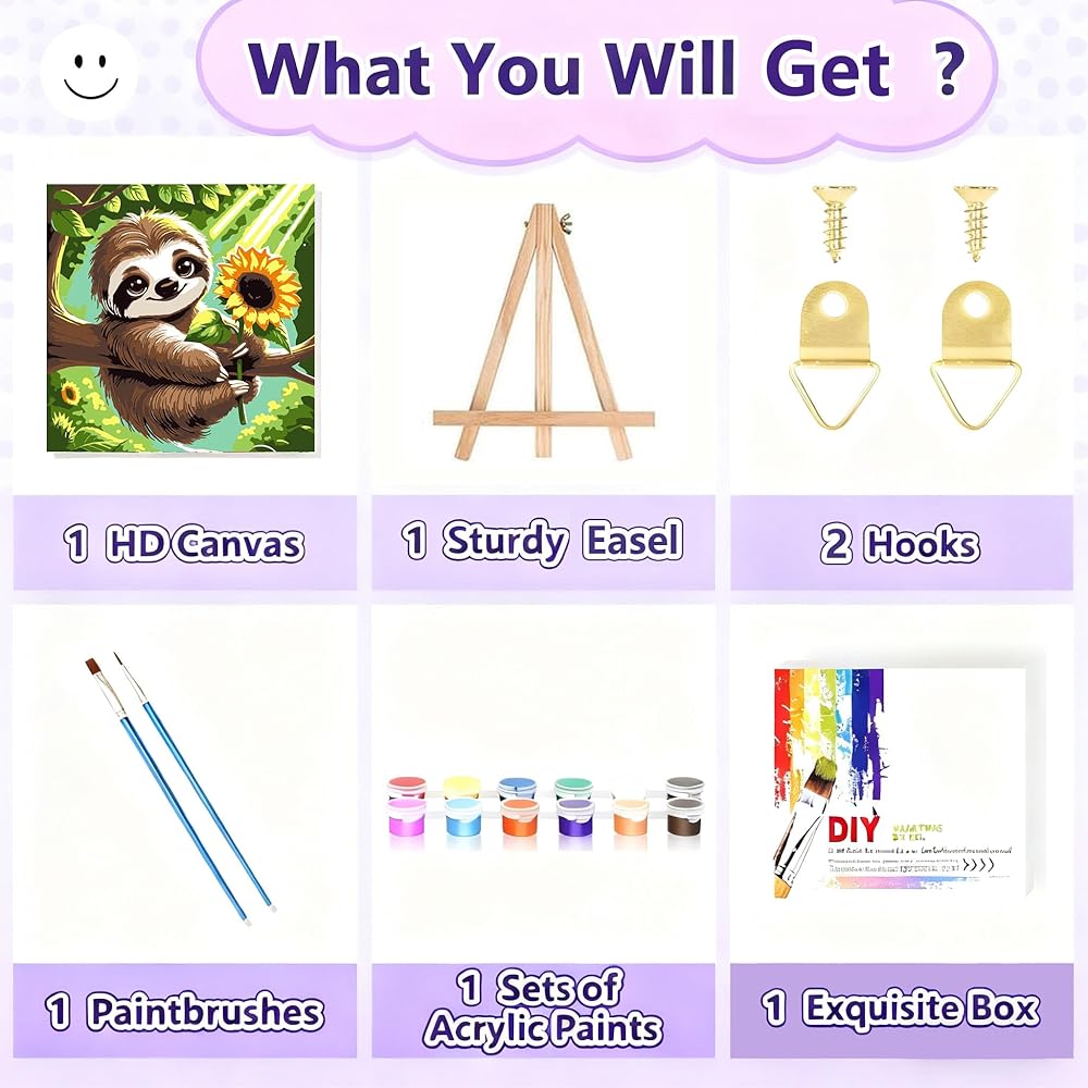 تتضمن مجموعة الطلاء بالأرقام من Gemozaic Cute Sloth Kids: لوحة قماشية عالية الدقة مؤطرة بأرقام مطبوعة، وحامل خشبي، وطلاءات أكريليك، وفرش نايلون، وخطافات ومسامير مثبتة على الحائط