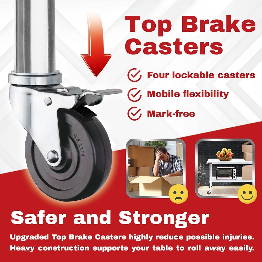 التحرك بحرية: يمكن لعربة طاولة العمل DuraSteel أن تكون متنقلة في كل مكان دون بذل جهد. الفرامل العلوية المطورة تجعلها آمنة ومستقرة. * نقترح عدم وضع أكثر من 150 رطلاً على السطح للتدحرج بسلاسة